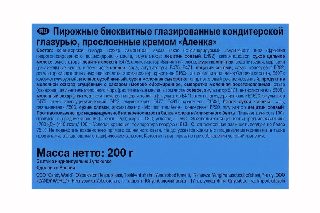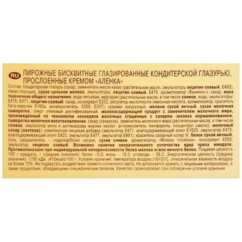 Состав: кондитерская глазурь сахар, заменитель масла какао фракция гидрогенизированного пальмоядрового масла, эмульгаторы: лецитин соевый, Е492, какао-порошок, сухое цельное молоко, эмульгаторы: лецитин соевый, Е476, ароматизатор Ванилин, сахар, вода питьевая, глюкозно-фруктозный сироп, мука пшеничная общего назначения, маргарин рафинированные дезодорированные фракционированные, частично гидрогенизированные растительные масла пальмовое, подсолнечное, соевое, пальмоядровое, вода, эмульгаторы: Е475, е471, лецитин соевый; соль, сахар, консервант Е202, регулятор кислотности - кислота лимонная, ароматизатор, краситель бета-каротин Е160а, антиокислитель: Е300, е307; крахмал кукурузный, меланж сухой яичный, спирт этиловый ректификованный, сухое цельное молоко, сгущенное с сахаром молоко цельное молоко, сахар, сухая молочная сыворотка, комплексная пищевая добавка эмульгатор Е471, влагоудеривающий компонент Е1520, эмульгатор Е475, влагоудерживающий агент Е422, эмульгатор Е477, эмульгатор Е491; краситель сахарный колер Iv, белок сухой яичный, соль, разрыхлитель - гидрокарбонат натрия, сухие сливки, ароматизатор Молоко топленое, консервант Е200, эмульгатор лецитин соевый. кондитерская глазурь сахар, заменитель масла какао растительные негидрогенизированные масла пальмовое, ши, иллиппе, подсолнечное, какао-порошок, сухое цельное молоко, эмульгаторы: лецитин соевый, Е476, ароматизатор Ванилин, сахар, вода питьевая, глюкозно-фруктозный сироп, мука пшеничная общего назначения, маргарин масла растительные рафинированное дезодорированное пальмовое, частично гидрогенизированное подсолнечное, вода, эмульгаторы: Е471, е475, консервант Е202, регулятор кислотности - кислота лимонная, ароматизатор Сливки, краситель Е160а, крахмал кукурузный, меланж сухой яичный, спирт этиловый ректификованный, сухое цельное молоко, сгущенное с сахаром молоко цельное молоко, сахар, сухая молочная сыворотка, эмульгаторы Е471, е475, е477, е491, краситель сахарный колер, белок сухой яичный, соль, разрыхлитель - гидрокарбонат натрия, сухие сливки, ароматизатор Молоко топленое, консервант Е200, эмульгатор лецитин соевый.