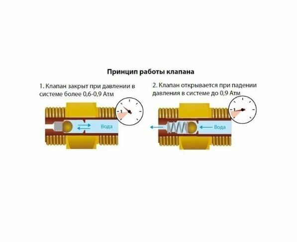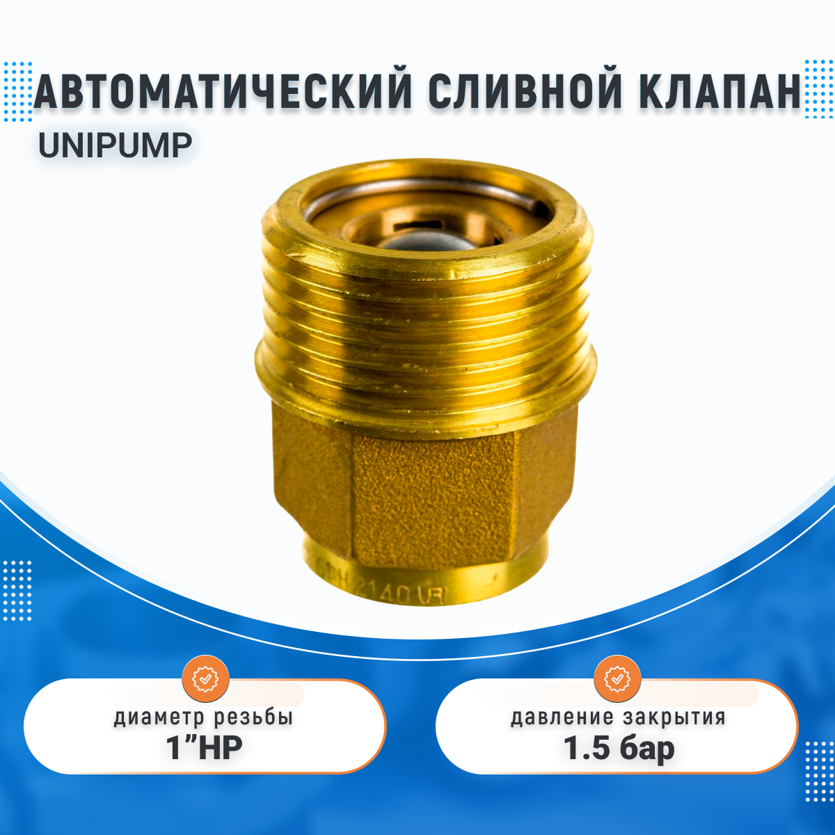Автоматический сливной клапан Unipump предназначен для автоматического слива остатков воды в скважину в зимний период с целью исключения замерзания воды в напорной магистрали. При снижении давления до 0.6-0.7 бар клапан открывается и вода сливается из магистрали в скважину. При запуске насоса и повышении давления до 1.5 бар клапан снова закрывается. Изготовлен из латуни.