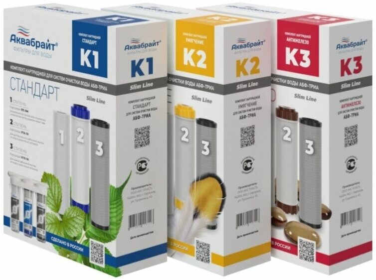 Комплекты картриджей предназначены для установки или замены в трёхступенчатых системах предварительной очистки воды АБФ-ТРИА. Комплект К-1 Аквабрайт Стандарт предназначен для механической и сорбционной очистки воды.