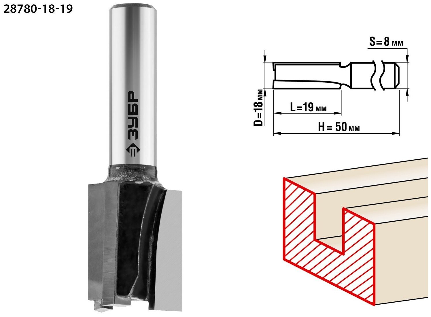 Фреза пазовая прямая, D= 18мм, рабочая длина-19мм, хв.-8 мм, ЗУБР Профессионал