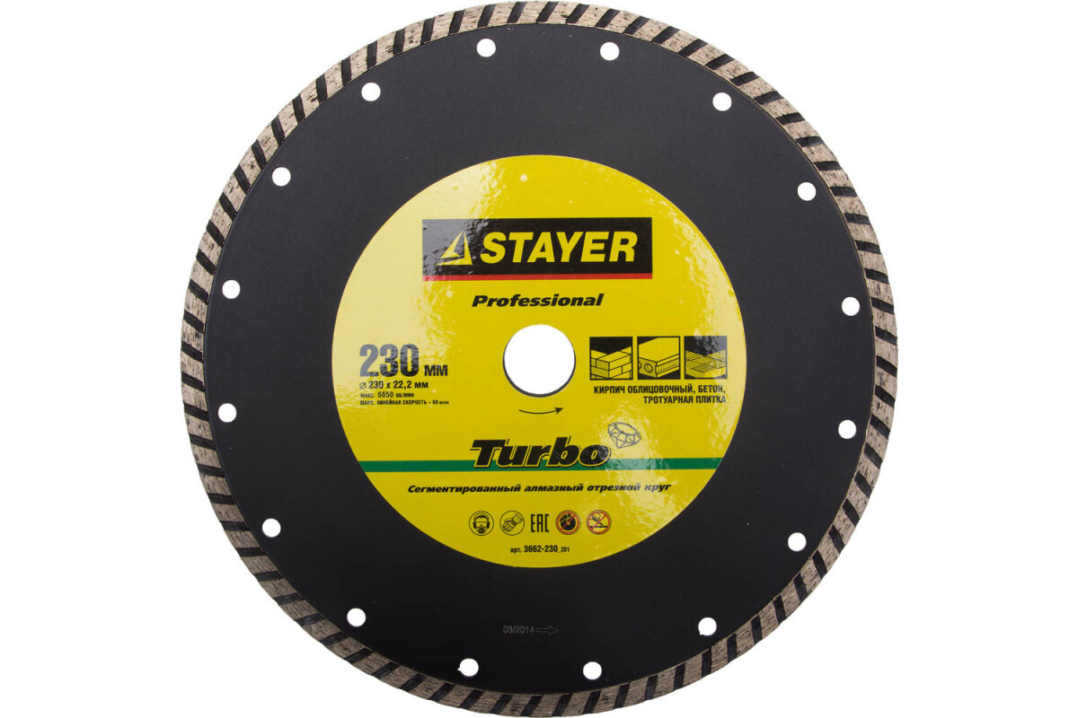 Исключительно высокий уровень качества отрезных алмазных дисков Stayer Turbo Professional гарантирован комплексной системой контроля всего процесса производства: от качества поступающего сырья до готовой продукции. Корпуса алмазных дисков изготовлены из прочной легированной стали, способной выдержать значительную механическую нагрузку и высокую температуру. Отлично подходит резки бетона, бордюрного камня, облицовочного кирпича, тротуарной плитки и других строительных материалов без принудительного охлаждения. Применяется на УШМ.Преимущества: Сегментированная форма режущей кромки позволяет быстро и эффективно осуществлять необходимые резы в обрабатываемом материале. Оптимально подобранные компоненты металлической связки гарантируют продолжительный рабочий ресурс диска. Чистый рез и эффективная работа без принудительного охлаждения. Минимизация бокового трения благодаря сегментированной форме режущей кромки.