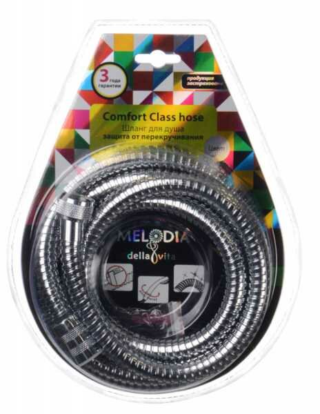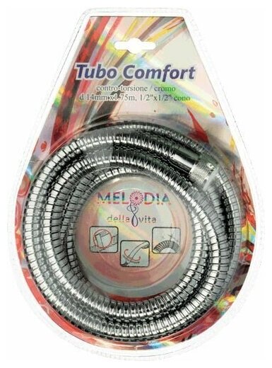Шланг для душа Melodia della vita 1/2"*1/2" конус. ПВХ с оплеткой из нержавеющей стали диаметром 14 мм, длинной 175 см. Серия Tubo Comfort имеет двойной зажим и защиту от перекручивания. Шланг упакован в блистер. Присоединение к смесителю с помощью накидной гайки 1/2" (16 мм), присоединение лейки с помощью конусной накидной гайки 1/2" (16 мм). Шланг подходит к импортным смесителям и лейкам.