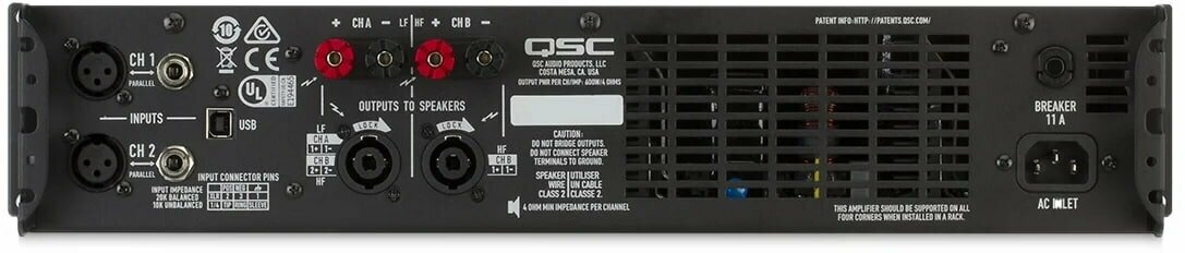 Выходы: Профессиональные полюсные клеммы и разъемы NL4 (совместимые с NL2) дают возможность подключения акустических систем как в моно-варианте, так и с подключением двух усилителей.
