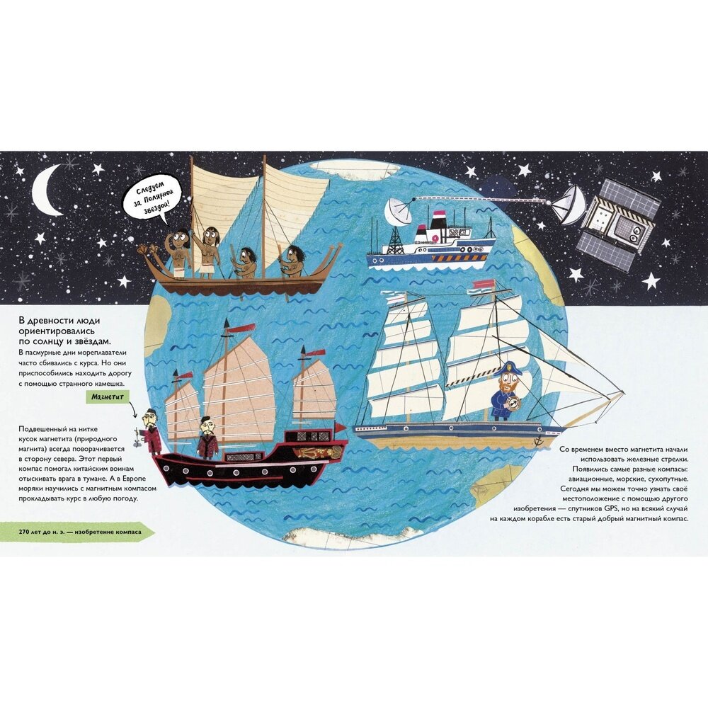 Нас окружают невероятные Изобретения. Мы настолько к ним привыкли, что даже не можем представить жизнь без них. А знаешь ли ты, когда они появились? С чего всё началось? Открывай скорее эту книгу и отправляйся в путешествие по эпохам и континентам, чтобы узнать, какие изобретения изменили ход нашей истории - от колеса до марсохода, от магнита к GPS, знакомься с изобретателями бумаги, часов, вакцин, двигателей, компьютера…