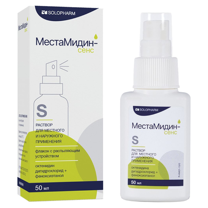 Фармакологическое действие МестаМидин-сенс обладает широким спектром антимикробного действия, фунгицидной и вирулицидной активностью за счет гидрофобного взаимодействия октенидина дигидрохлорида и феноксиэтанола с цитоплазматическими мембранами патогенных микроорганизмов. Спектр антимикробной активности охватывает споровую и аспорогенную микрофлору, грамположительные и грамотрицательные бактерии (аэробные и анаэробные), грибы рода дерматофитов и кандида, липофильные вирусы, микоплазмы, уреаплазмы. Резистентность при кратковременном или длительном применении МестаМидин-сенс не развивается. Препарат не оказывает токсического действия и практически не всасывается через слизистые оболочки, кожу и раневые поверхности, уничтожает микроорганизмы, не повреждая клетки тканей. Применение препарата способствует заживлению ран, ожогов. Лекарственное взаимодействие Не использовать совместно с йодсодержащими антисептиками из-за возможности выраженного изменения цвета кожи на смежных участках от коричневого до фиолетового. Если пациент применяет вышеперечисленные или другие лекарственные препараты (в т.ч. безрецептурные), перед применением препарата МестаМидин-сенс следует проконсультироваться с врачом.