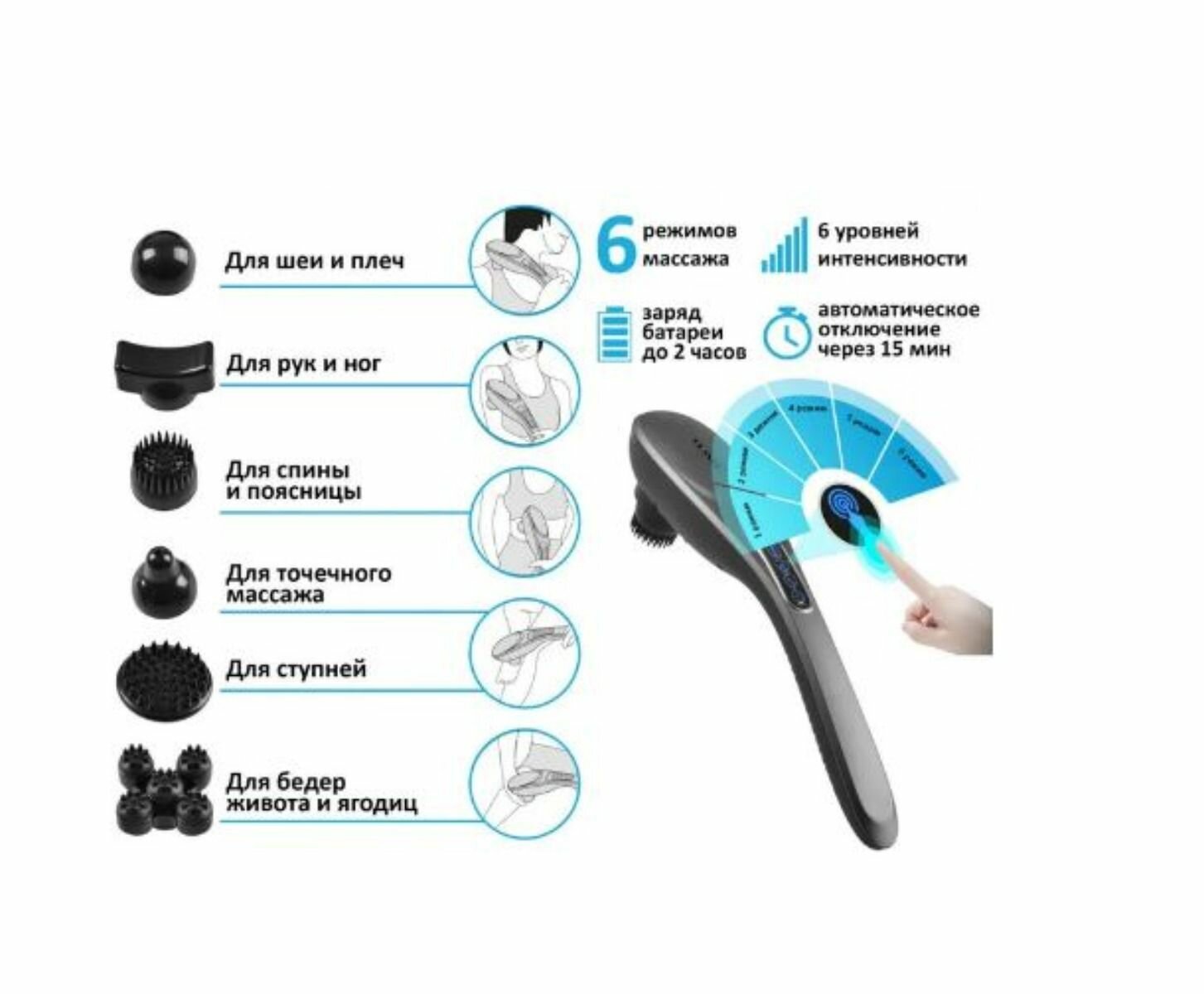 6 режимов массажа и 6 уровней интенсивности .6 насадок в комплекте: для общего расслабляющего массажа, для точечного, для мягкого расслабляющего массажа, акупунктурная точечная насадка, широкая акупунктурная и 5ти главая акупунктурная насадка. Предотвращает застой крови и лимфы, ведет к уменьшению отечности и борется с целлюлитом. Беспроводной вибромассажер полезен тому, кто ведет активный образ жизни.