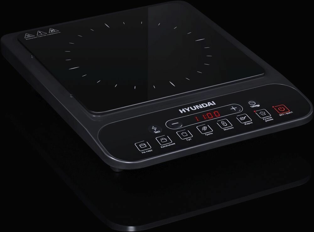 Электрическая плитка Hyundai с электронным управлением оснащена индукционной конфоркой, обеспечивающей быстрое закипание и высокую точность регулировки нагрева.