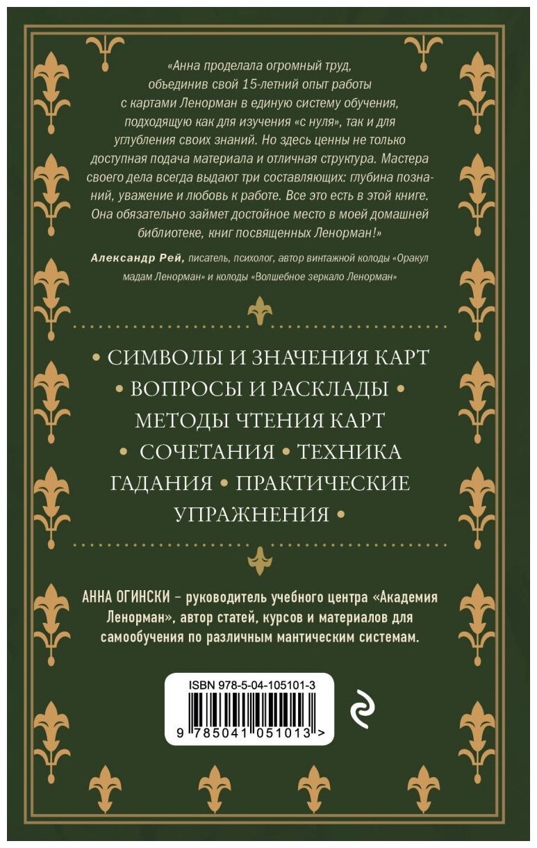 В основе этой книги - обучающий авторский курс Анны Огински, ведущего преподавателя учебного центра "Академия Ленорман". Здесь вы найдете подробное описание ключевых значений каждой карты по основным сферам (любовь, деньги, работа, здоровье и т.д.), особенности толкования, расклады, техники чтения дуплетов и триплетов, а также - практические задания и упражнения, которые позволят вам самостоятельно освоить работу с этим замечательным Оракулом.