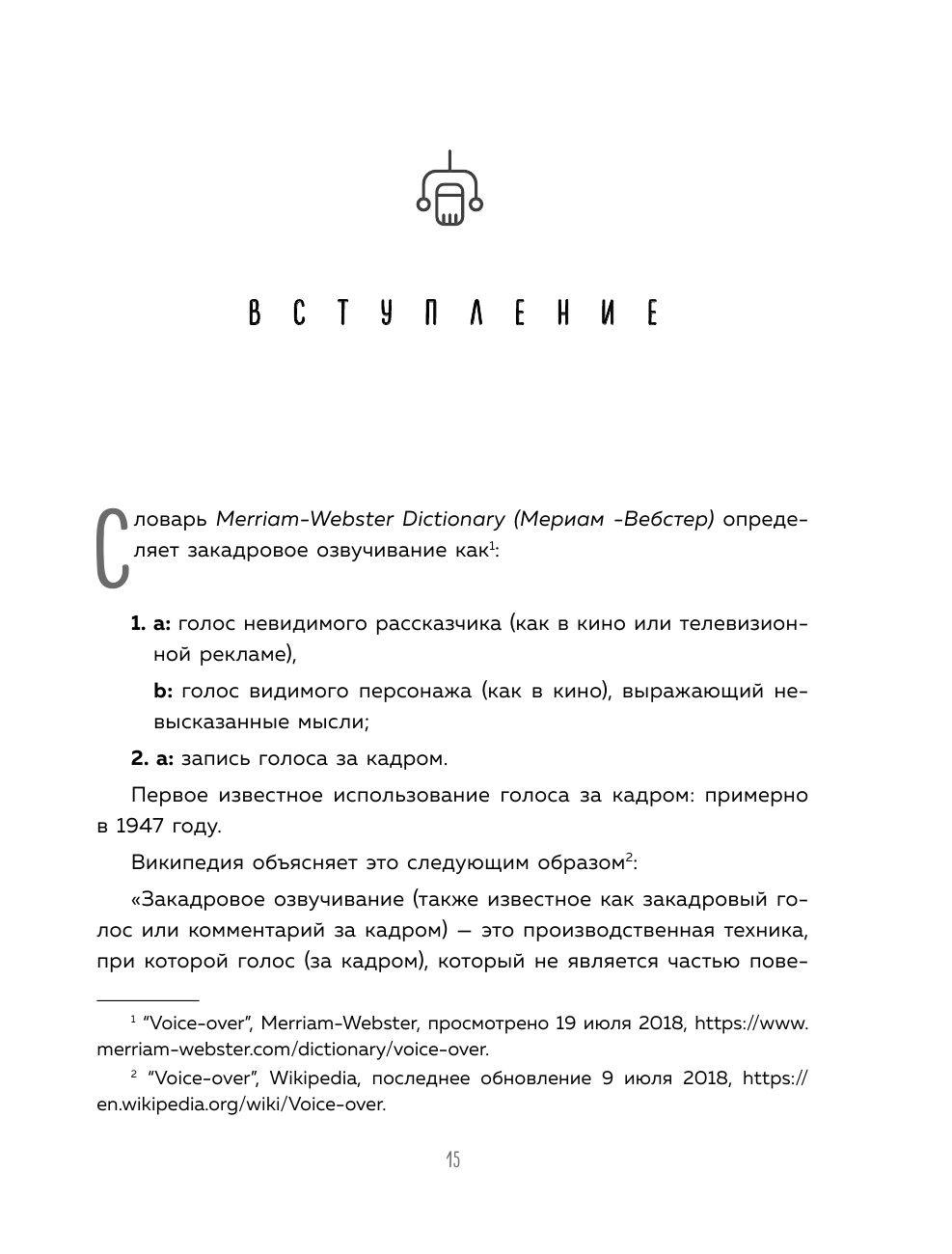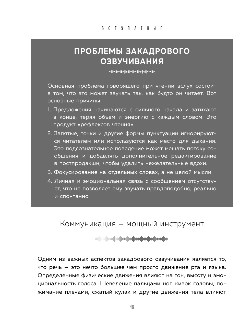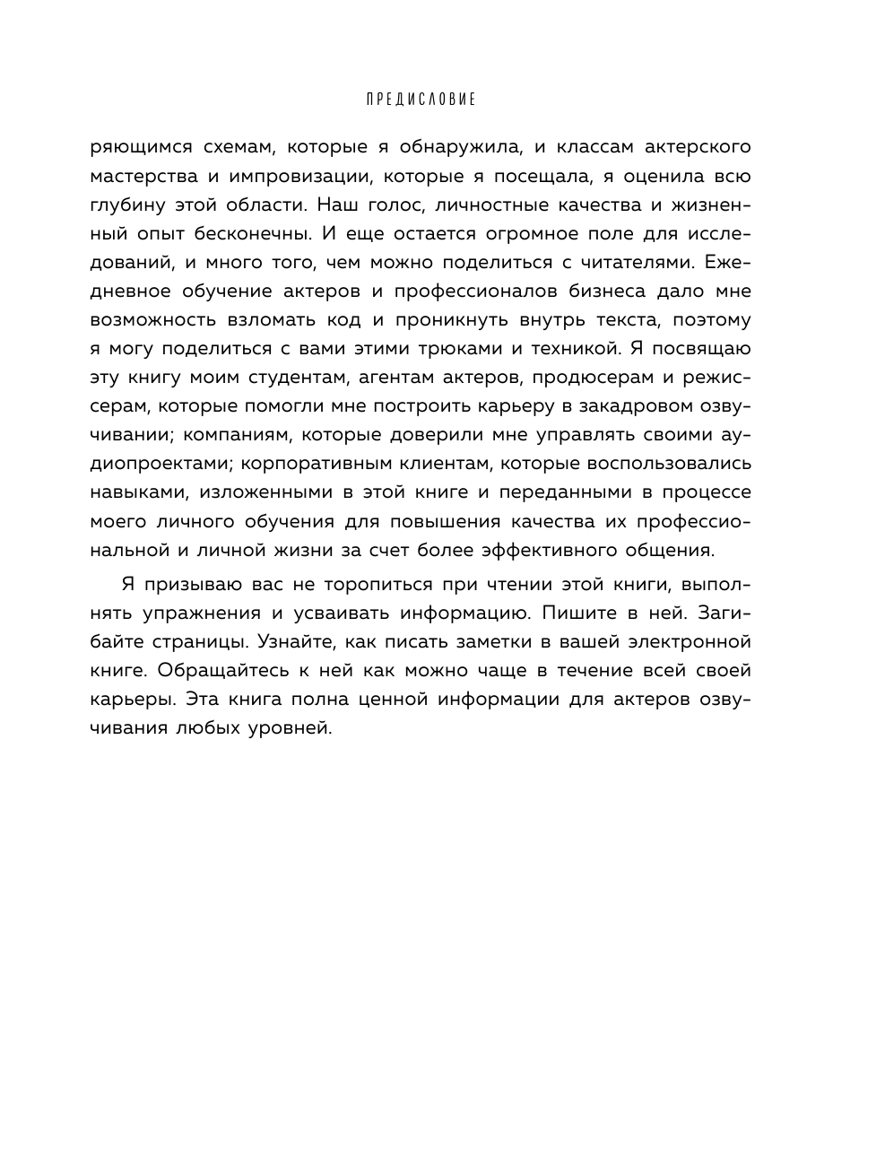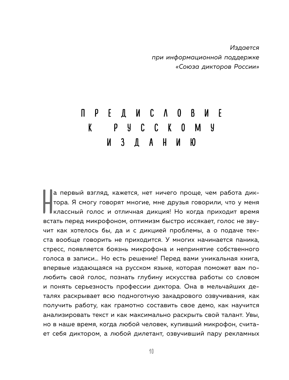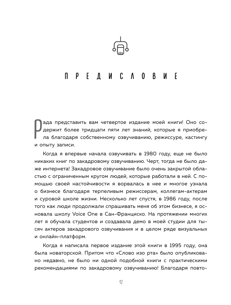 "Библия" в сфере профессиональной озвучки впервые на русском языке! Здесь вы найдете практические советы, касающиеся всех аспектов сферы дубляжа: неважно, собираетесь ли вы читать новости по радио или записывать аудиокнигу, станете новым голосом Siri или решите озвучить Warcraft. Эта книга станет полезной находкой не только для новичков, но и для профессионалов. Автор приводит подробные разборы рекламных роликов и сценариев, делится упражнениями для постановки и разминки голоса, рассказывает, как сделать речь живой и артистичной и как выбрать агента для поиска работы.
