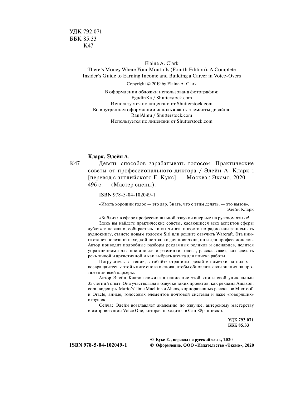 Девять способов зарабатывать голосом. Практические советы от профессионального диктора (Кларк Элейн А.); Бомбора, 2020