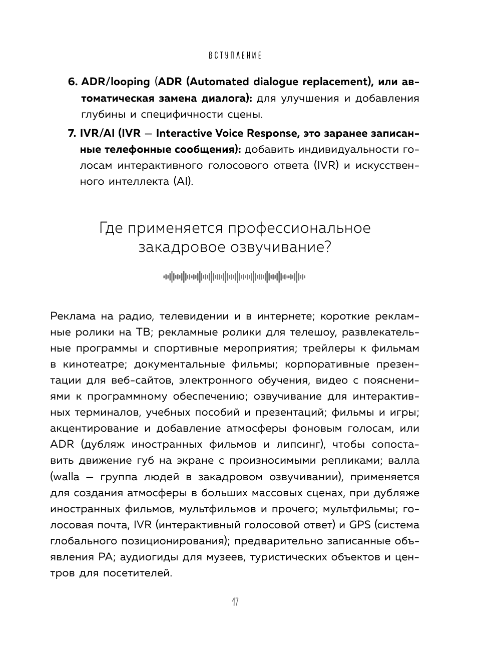 Считаю что эту книгу должны прочесть не только те, кто занимается озвучкой игр, аудиокниг или дубляжом фильмов. (А так же, кто хотят стать звездами озвучки) В книге много вещей, которые важно узнать ВСЕМ, кто использует голос в своей профессии: это учителя, лекторы, коучи, тренеры, продавцы-консультанты, менеджеры, агенты, ведущие шоу и мероприятий, певцы (обязательно!) и даже просто студенты. А еще- все кто хочет быть успешным видео-блогером, хочет записывать себя любимого для Инстаграмм и т.д. Это отличная книга! очень полезная и прокачивающая! Рекомендую.