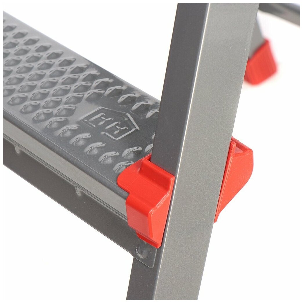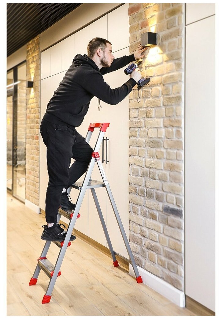 Стремянка очень удобная и эргономичная. Не тяжелая, но при этом устойчивая - для женщины плюс. Удобно складывается и занимает немного места в сложенном виде. Площадка и ступени рельефные - против скольжения. На ручке есть мни-лоток - можно положить ручной инструмент, повесить небольшое ведро. Высота с площадки рассчитана для работы от 3 до 3,5 метров в зависимости от роста.
