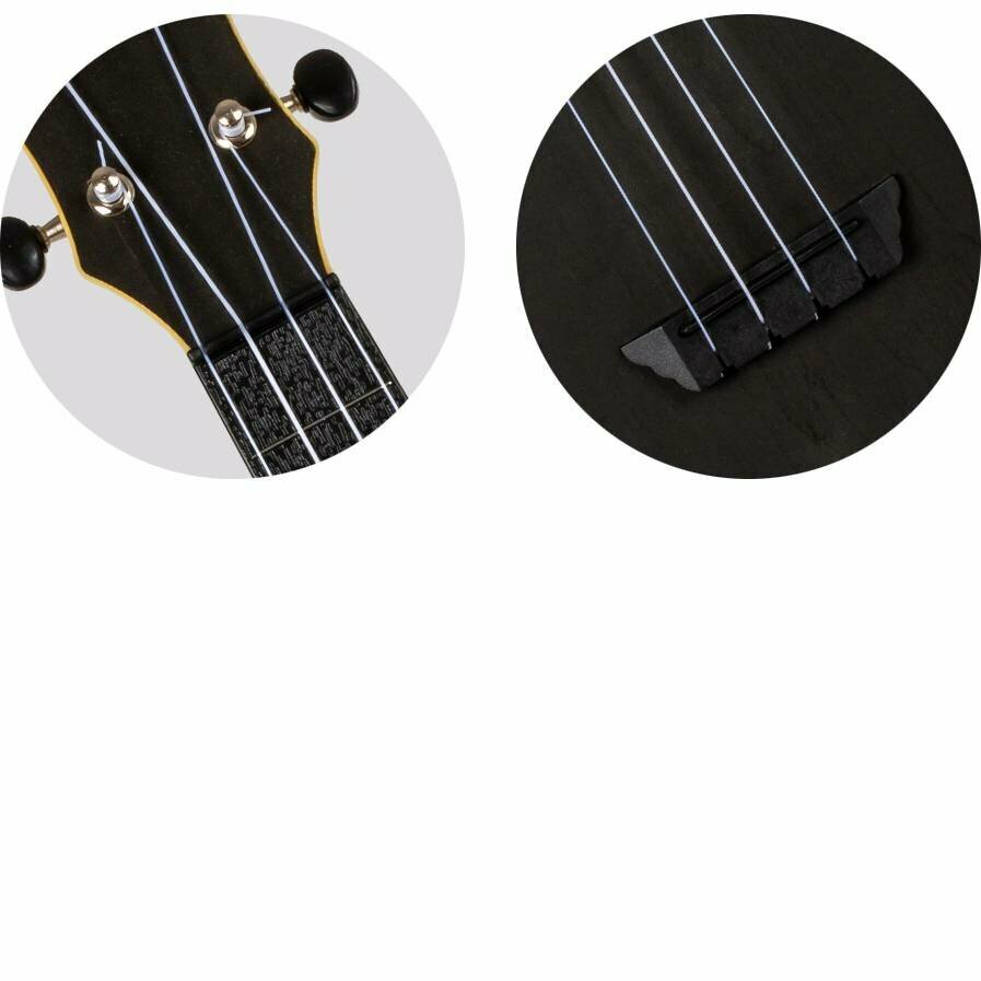 Яркий и насыщенный звук достигается благодаря особенностям конструкции - корпус укулеле сделан из технологичного композитного материала и имеет особую полукруглую форму, а резонирующая верхняя дека сделана из древесины.