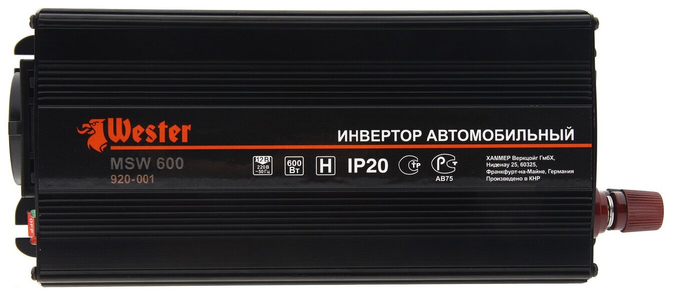 WESTER MSW600 — автомобильный инверторный преобразователь напряжения, используется для подключения бытовых приборов (220 В) к бортовой сети автомобиля или к любому источнику напряжения (12 В).Мощность: 600 ВтВходное напряжение: 12 ВВыходное напряжение: 220 ВГарантия: 5 летОсобенности модели MSW600:Инвертор компактный и легкий, помещается в бардачке автомобиля. Заряжайте мобильные телефоны, планшеты и другие гаджеты через USB-порт.Небольшая погрешность частоты - 5% от 50 Гц, подходит для бытовых приборов. Подключайте их через встроенную розетку 220 В.Прибор защищён от скачков напряжения и короткого замыкания. Встроенный вентилятор охлаждает инвертор, он не перегревается и стабильно работает.Преобразователь оснащён световыми индикаторами и звуковыми сигналами. Процесс работы удобно контролироватьWester — чешский производитель сварочного оборудования, стабилизаторов напряжения, тепловентиляторов и др. Официальный дилер в России – компания «220 Вольт».