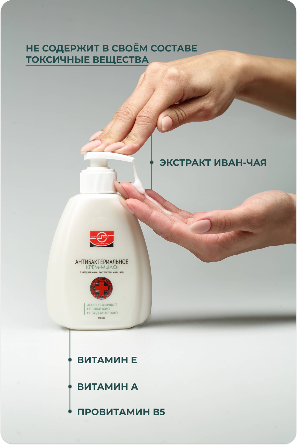 Жидкое крем-мыло «Сибирская линия» антибактериальное на основе натурального экстракта иван-чая, обладает эффективным моющим и очищающим свойствами, а также пролонгированным и противомикробным действиями, сохраняющимися в течение всего периода использования.Обладает питающим, противовоспалительным и противозудным действиями, восстанавливает мелкие повреждения, является эффективным средством профилактики кишечных инфекций.Преимущество жидкого крем-мыла «Сибирская линия» антибактериальное в густой консистенции и мягкой формуле, которая не раздражает, не сушит кожу и не вызывает аллергических реакций.Имеется экспертное заключение с подтверждением заявленных свойств от «Новосибирского Научно-исследовательского института гигиены» Роспотребнадзора.Не содержит в своём составе токсичные вещества, парабены, красители, силиконы.Удобная форма флакона с дозатором обеспечит гигиеничность и экономность в расходовании средства.