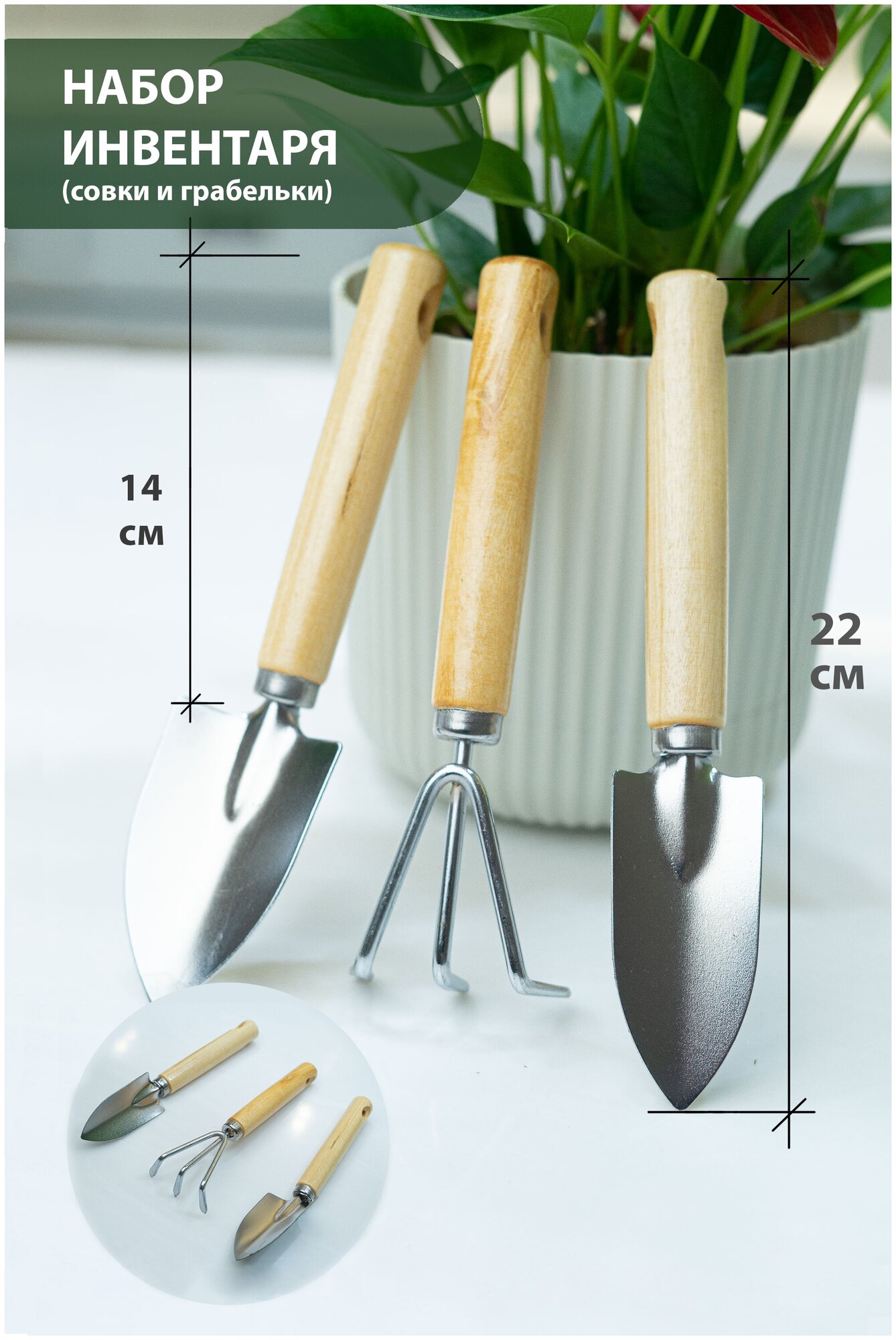 Набор включает в себя широкий совок, узкий совок и рыхлитель, с помощью которых можно высаживать и пересаживать растения, а также производить прополку почвы. Комплектация: - Совок широкий 18 х 7 х 4,5 см - 1 шт; - Совок узкий 18 х 8 х 3 см - 1 шт; - Рыхлитель 16 х 6 х 3 см - 1 шт. Применяется для ухода за огородом и садом. Материал: дерево, металл; Количество предметов: 3 шт.