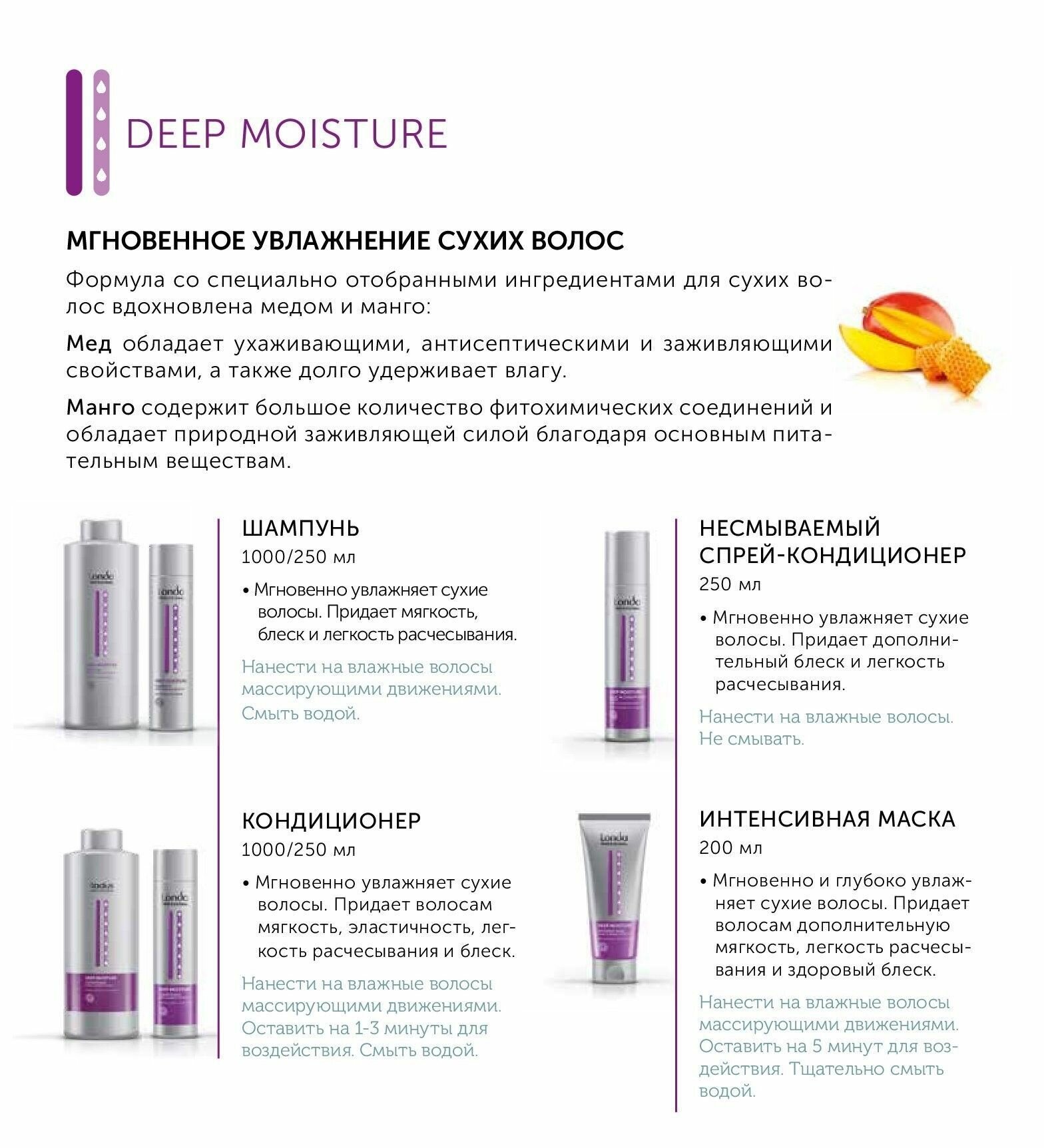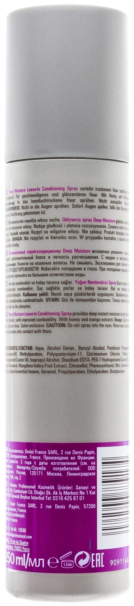 Несмываемый спрей-кондиционер Deep Moisture мгновенно увлажняет сухие волосы. Придает дополнительный блеск и легкость расчесывания. Эксклюзивно для салонов красоты.