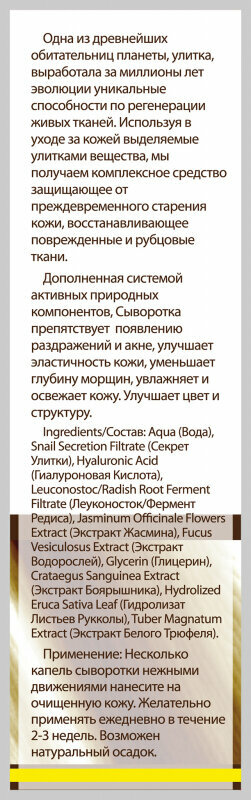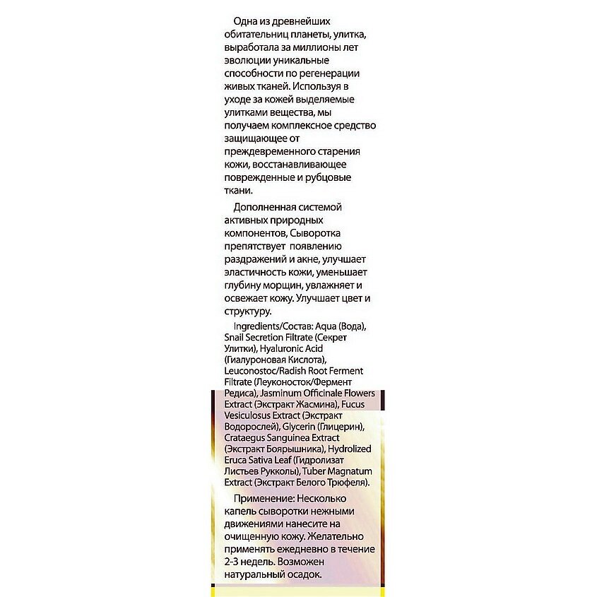 | Состав | aqua (вода), snail secretion filtrate (секрет улитки), hyaluronic acid (гиалуроновая кислота), leuconostoc/radish root ferment filtrate (леуконосток/фермент редиса), jasminum officinale flowers extract (экстракт жасмина), fucus vesiculosus extract (экстракт водорослей), glycerin (глицерин), crataegus sanguinea extract (экстракт боярышника), hydrolized eruca sativa leaf (гидролизат листьев рукколы), tuber magnatum extract (экстракт белого трюфеля) |