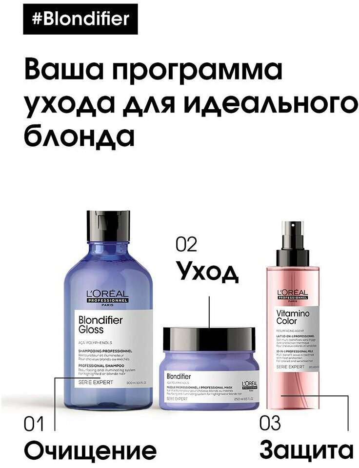 Шампунь-сияние для осветленных и мелированных волос. Шампунь мягко устраняет загрязнения с поверхности волоса, придавая осветленным или мелированным волосам многогранный блеск.
