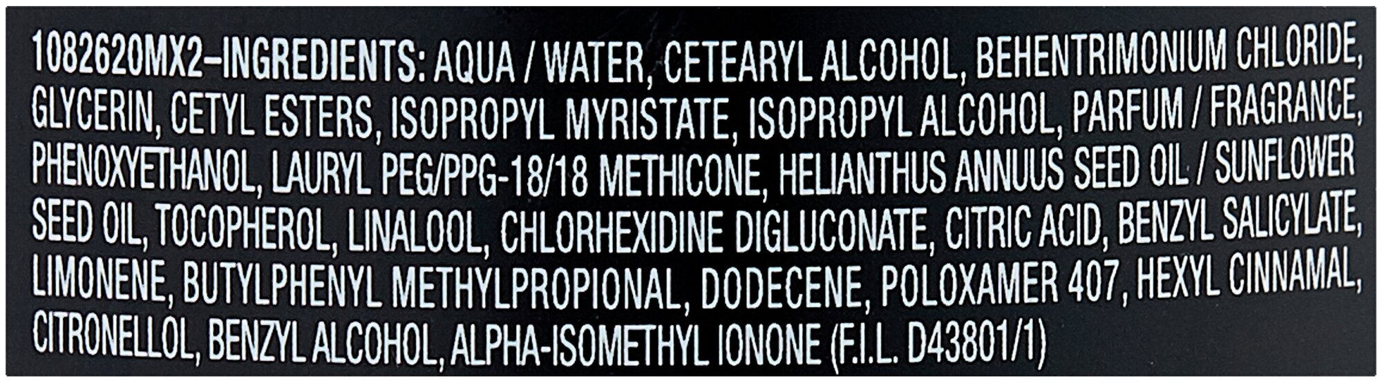 Состав: aqua / water, cetearyl alcohol, behentrimonium chloride, glycerin, cetyl esters, isopropyl myristate, isopropyl alcohol, parfum / fragrance, phenoxyethanol, lauryl peg/ppg-18/18 methicone, helianthus annuus seed oil / sunflower seed oil, tocopherol, linalool, chlorhexidine digluconate, citric acid, benzyl salicylate, limonene, butylphenyl methylpropional, dodecene, poloxamer 407, hexyl cinnamal, citronellol, benzyl alcohol, alpha-isomethyl ionone (f.i.l. d43801/1)