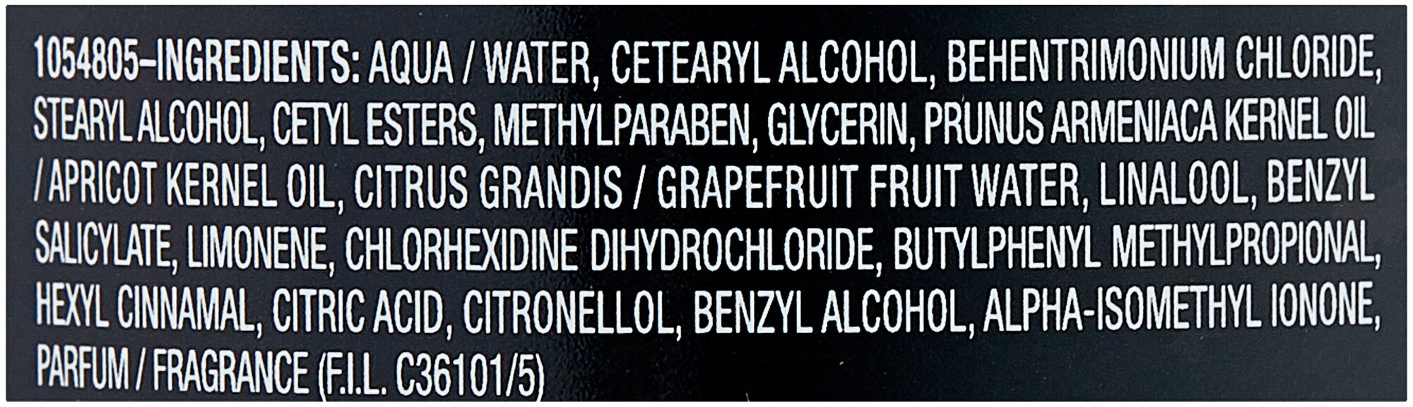Состав: aqua / water, cetearyl alcohol, behentrimonium chloride, stearyl alcohol, cetyl esters, methylparaben, glycerin, prunus armeniaca kernel oil / apricot kernel oil, citrus grandis / grapefruit fruit water, linalool, benzyl salicylate, limonene, chlorhexidine dihydrochloride, butylphenyl methylpropional, hexyl cinnamal, citric acid, citronellol, benzyl alcohol, alpha-isomethyl ionone, parfum / fragrance (f.i.l. c36101/5)