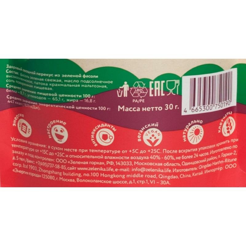 Зеленика Овощной здоровый перекус "Зеленая фасоль" 30 г (Зеленика) (ZELN0008-0030)