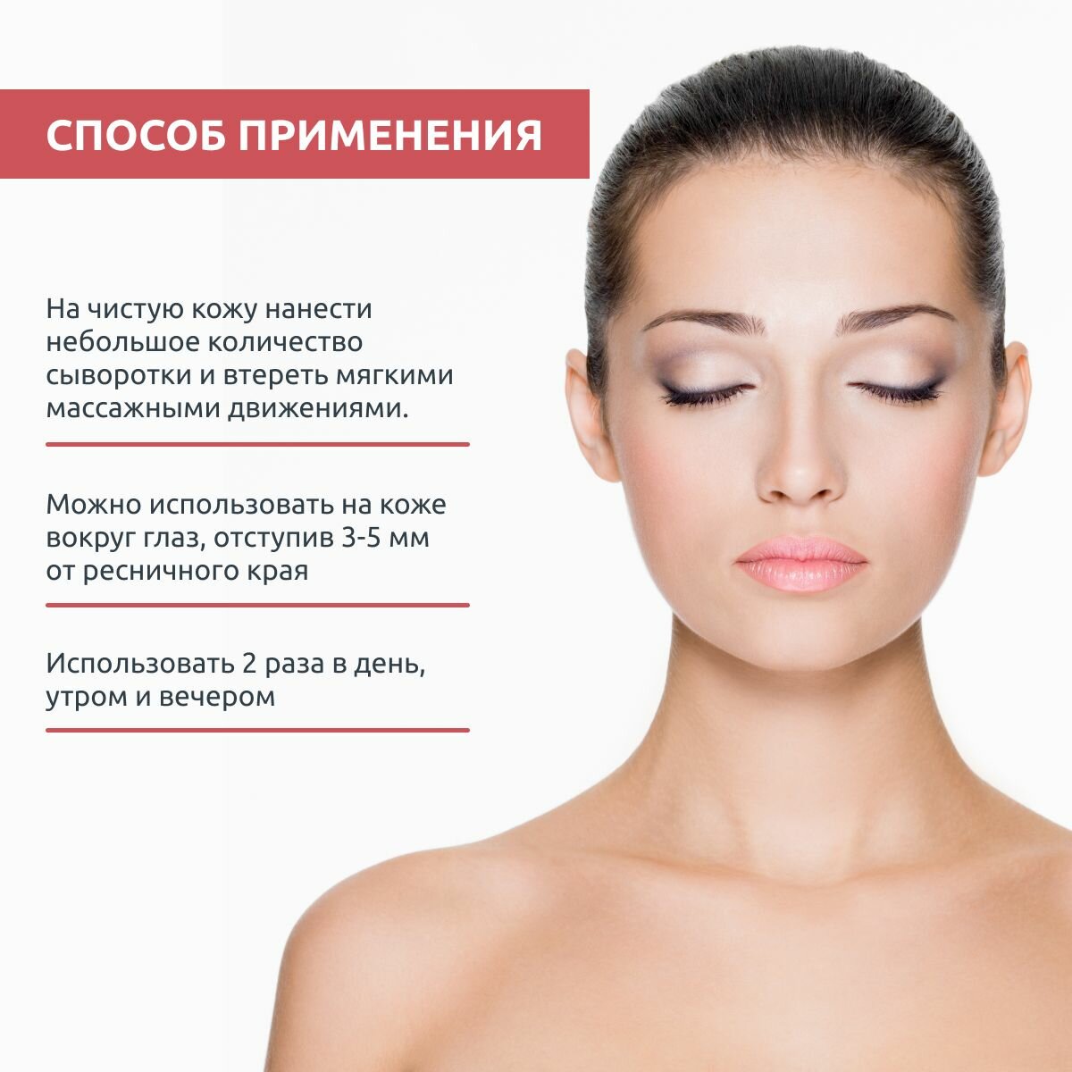 | Применение | на чистую кожу нанести небольшое количество сыворотки и втереть мягкими массажными движениями. Использовать 2 раза в день, утром и вечером. Можно использовать на коже вокруг глаз, отступив 3-5 мм от ресничного края |