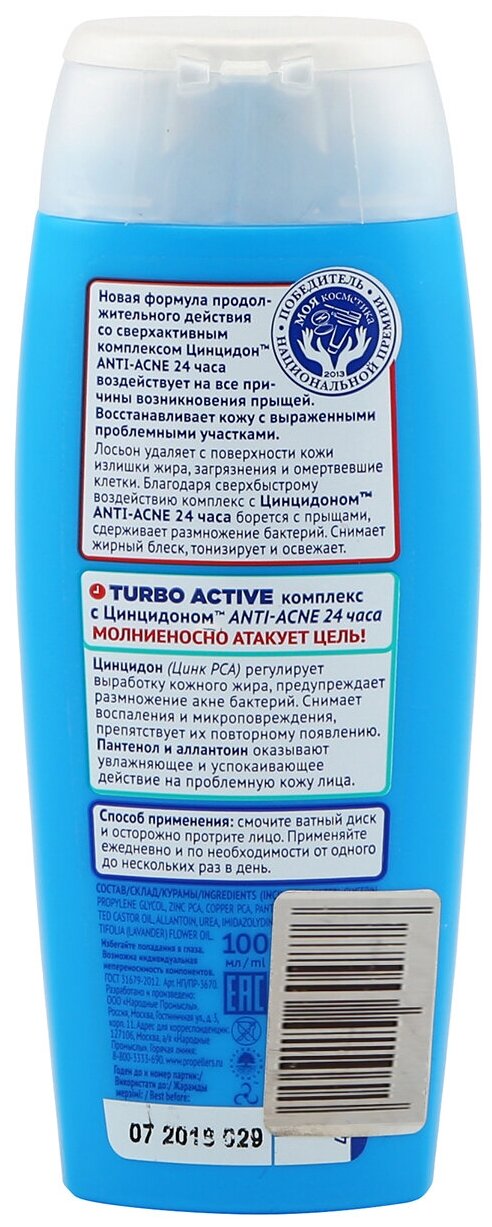 Создан специально для проблемой кожи, подверженной возникновению прыщей. Лосьон очищающий, в его состав входит новый, эффективный комплекс Цинцидон Anti Acne 24, действующий практически моментально.