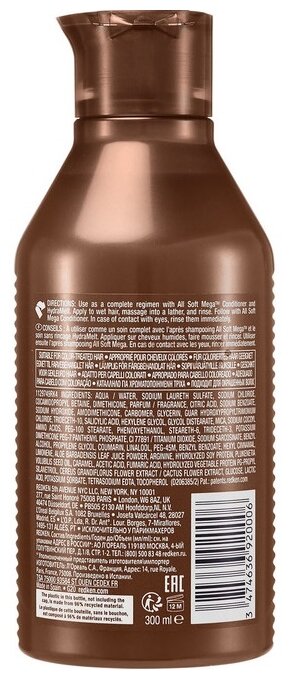 Нанесите на влажные волосы, вспеньте, смойте водой. Используйте в системе с кондиционером All Soft Mega и несмываемым уходом All Soft Mega.