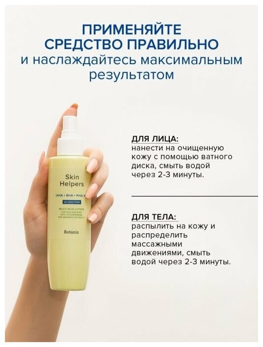 После применения лосьона рекомендуется завершить уход с помощью увлажняющего средства. В качестве профилактики врастаний волос на коже лица и тела применять 1-2 раза в неделю.