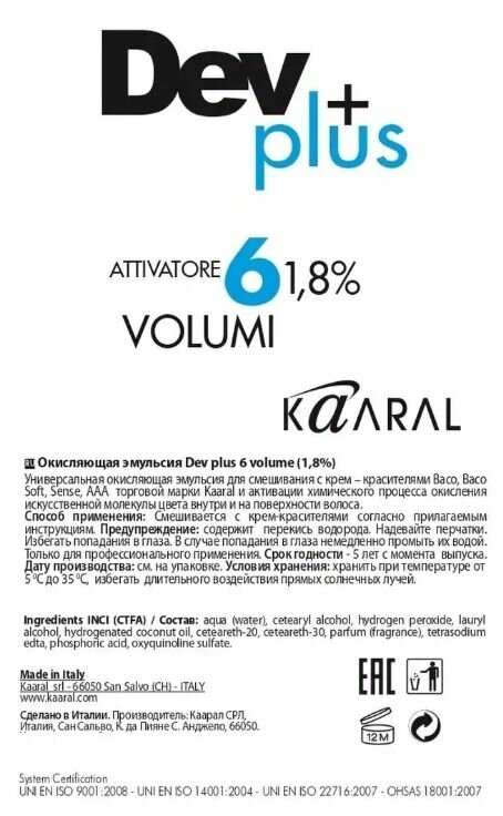 | Способ применения | Пропорции смешивания универсального окислителя Oxy Plus с крем-красителями Kaaral: Baco пропорции - 1:1.5Пропорция смешивания для тонирования |