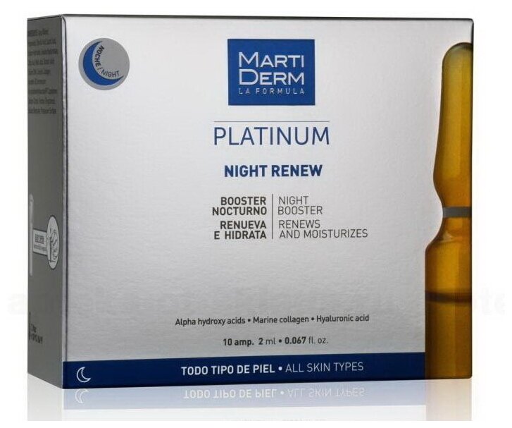 | Применение | наносить Martiderm Night Renew вечером непосредственно на лицо, шею и область груди после очищения и перед нанесением других средств. Используйте 1 ампулу в течение 2 дней, используя крышку и основание, предусмотренные для ее хранения |
