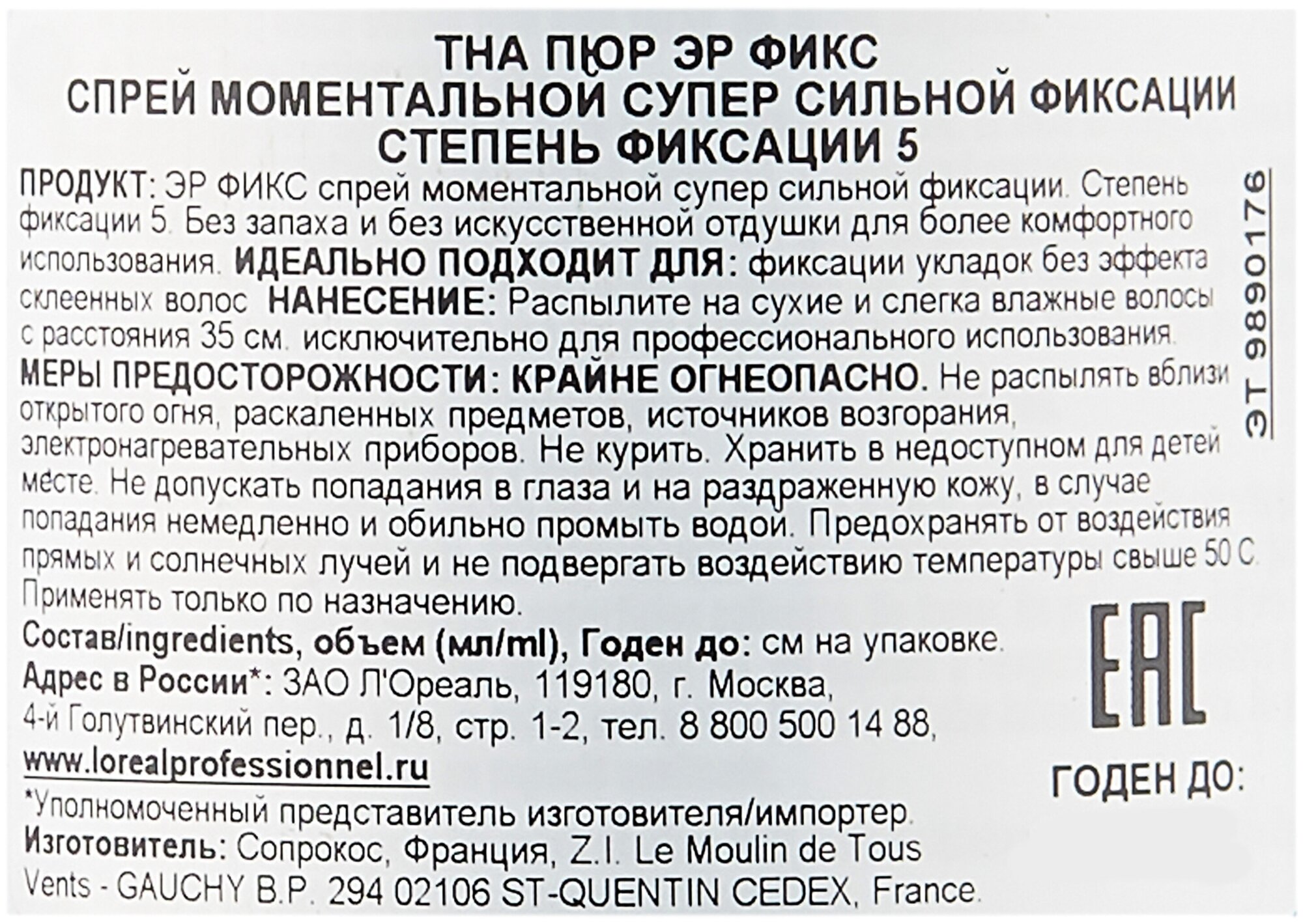 | Полное наименование | Loreal Professionnel - Спрей моментальной фиксации с защитой от влаги и УФ-лучей, 400 мл |