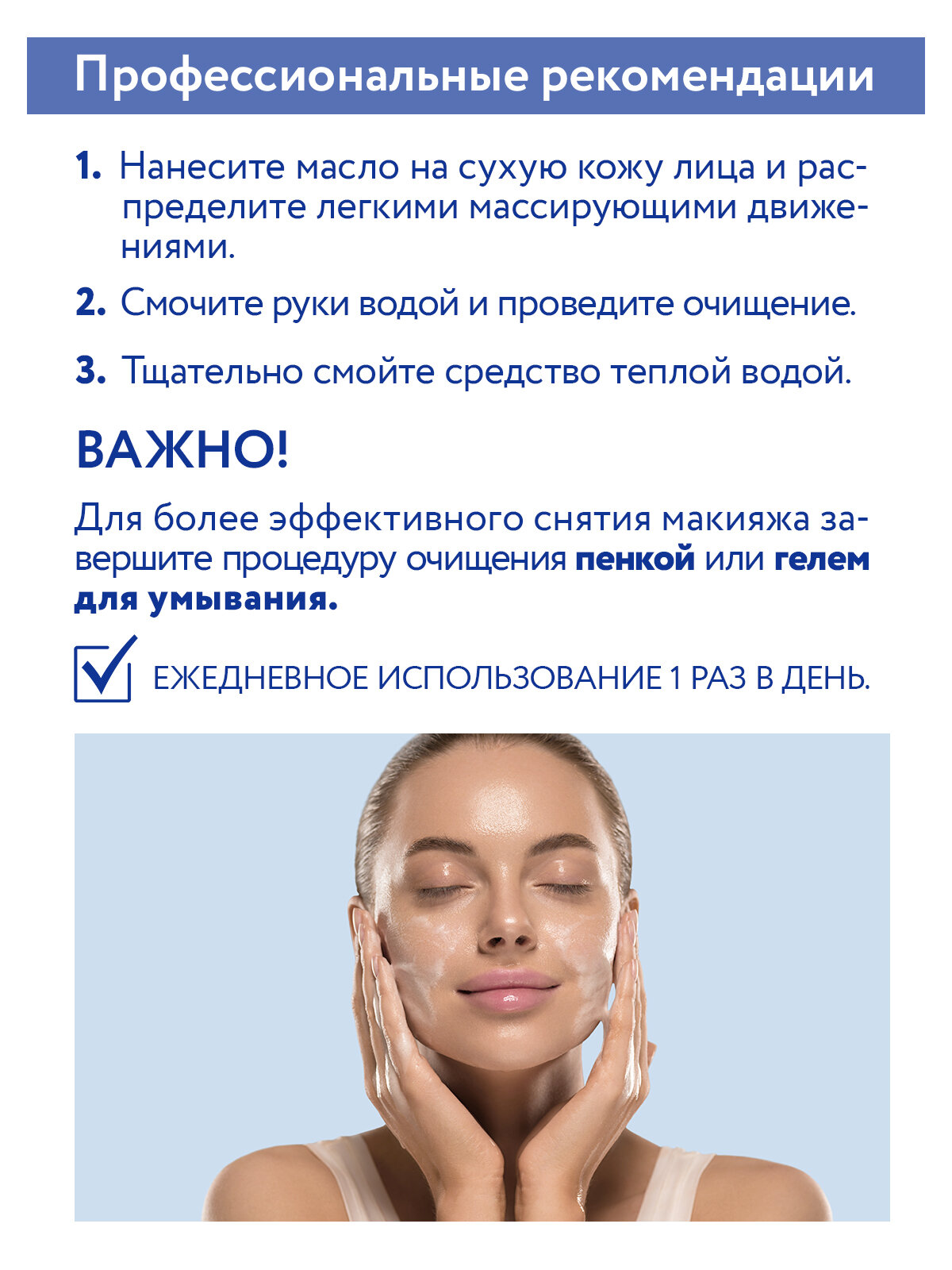 Нанесите масло на сухую кожу лица и распределите легкими массирующими движениями. Влажными руками проведите очищение и смойте теплой водой. При необходимости дополнительно используйте пенку или гель для умывания.