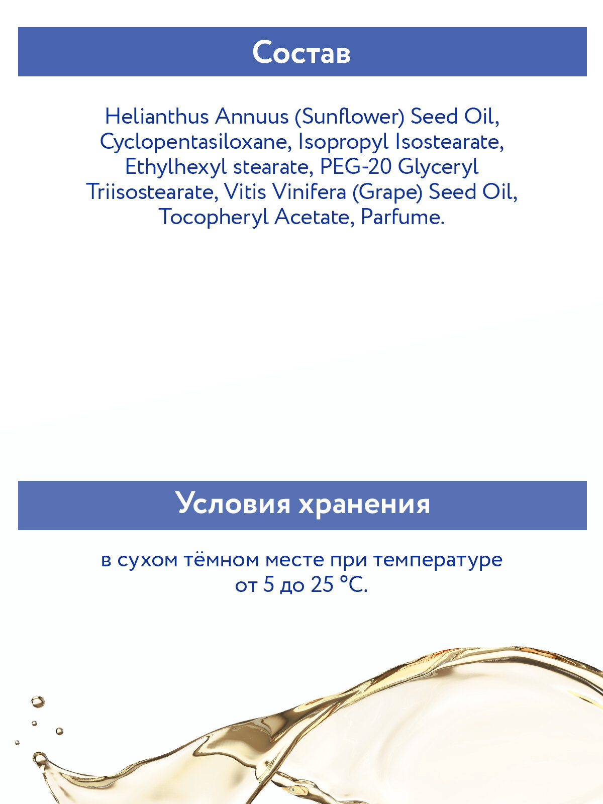 | Состав | Helianthus Annuus (Sunflower) Seed Oil, Cyclopentasiloxane, Isopropyl Isostearate, Ethylhexyl Stearate, PEG-20 Glyceryl Triisostearate, Vitis Vinifera (Grape) Seed Oil, Tocopheryl Acetate, Parfume. |