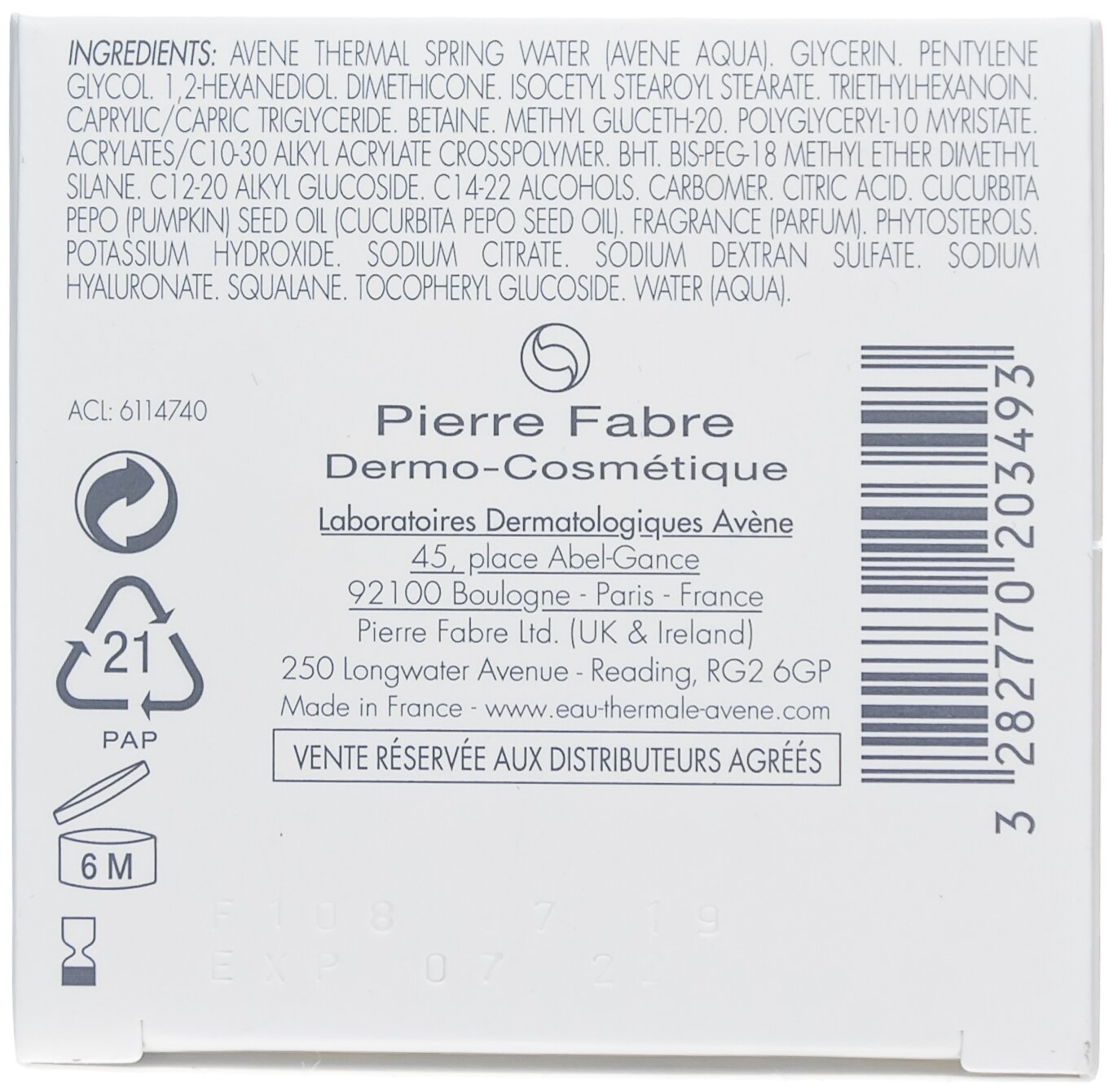 | Состав | avene aqua, glycerin, pentylene glycol, 1,2-hexanediol, dimethicone, isocetyl stearoyl stearate, triethylhexanoin, caprylic/capric triglyceride, betaine, methyl gluceth-20, polyglyceryl-10 myristate, acrylates/c10-30 alkyl acrylate crosspolymer, bht, bis-peg-18 methyl ether dimethyl silane, c12-20 alkyl glucoside, c14-22 alcohols, carbomer, citric acid, cucurbita pepo seed oil, parfum, phytosterols, potassium hydroxide, sodium citrate, sodium dextran sulfate, sodium hyaluronate, squalane, tocopheryl glucoside, aqua |