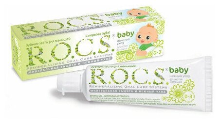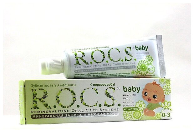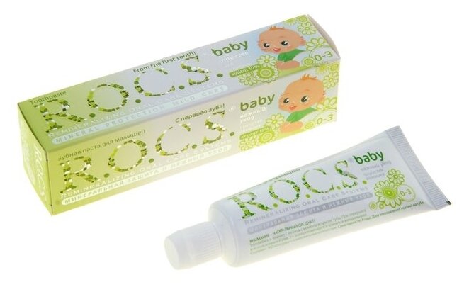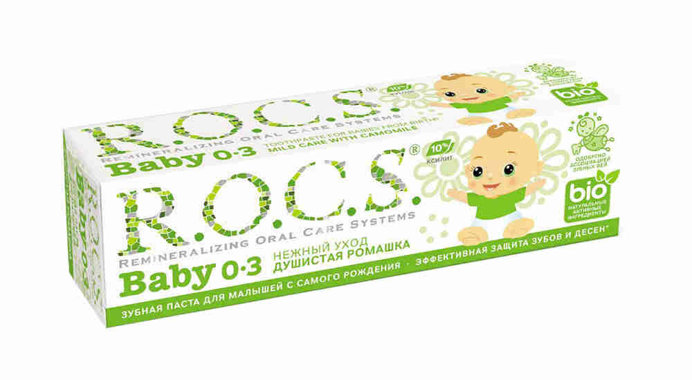 Зубная паста детская R.O.C.S. Baby Душистая Ромашка от 0-3 года (45 г)¶Безопасная при проглатывании и эффективная формула, легкий цветочный аромат - сделали эту зубную пасту несомненным хитом среди родителей и малышей! Уникальная зубная паста **предназначена для ухода за зубами малышей, начиная с самого раннего возраста. Природные компоненты – экстракт ромашки лекарственной и альгинат, вырабатываемый из морских водорослей, обеспечивают выраженное противовоспалительное действие. Благодаря высокой концентрации ксилита обеспечивает высокую степень защиты от кариеса*, а также обладает свойствами пребиотика, нормализуя состав микрофлоры полости рта*, что является особенно важным свойством при дисбактериозах кишечника и молочницах полости рта. Обладает приятным сладким цветочным ароматом, который очень нравится детям и мотивитрует их на регулярную чистку зубов, что очень важно для формирования постоянного навыка у детей. Гипоаллергенна*. Безопасна при проглатывании: не содержит фтор, отдушки, красители, лаурилсульфат натрия и парабены.