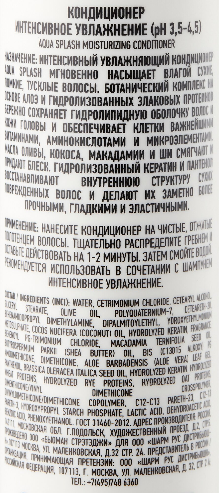 Интенсивный увлажняющий кондиционер Aqua Splash мгновенно насыщает влагой сухие, ломкие, тусклые волосы. Ботанический комплекс на основе алоэ и гидролизованных злаковых протеинов бережно сохраняет гидролипидную оболочку волос и кожи головы и обеспечивает клетки важнейшими витаминами, аминокислотами и микроэлементами.