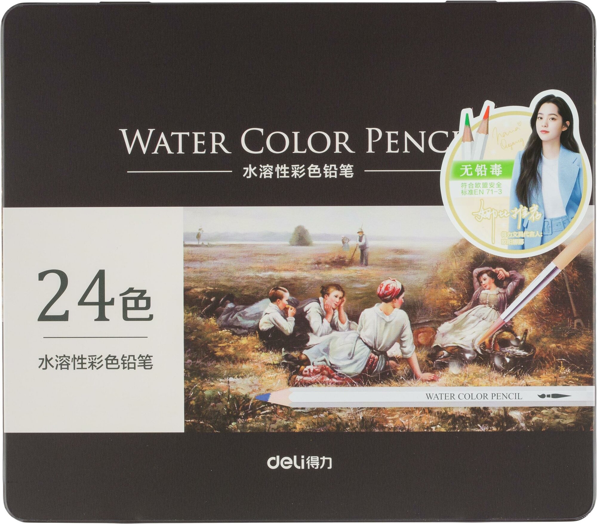 Deli Карандаши цветные акварельные в металлической коробке Nuevo 24 цвета Изделия снабжены грифелями ярких, насыщенных цветов. Линии мягко ложатся на бумагу. Целых 24 цветных акварельных карандаша в лаконичном корпусе. При контакте с водой штрихи карандаша теряют четкость линий, превращаясь в яркий оттенок.