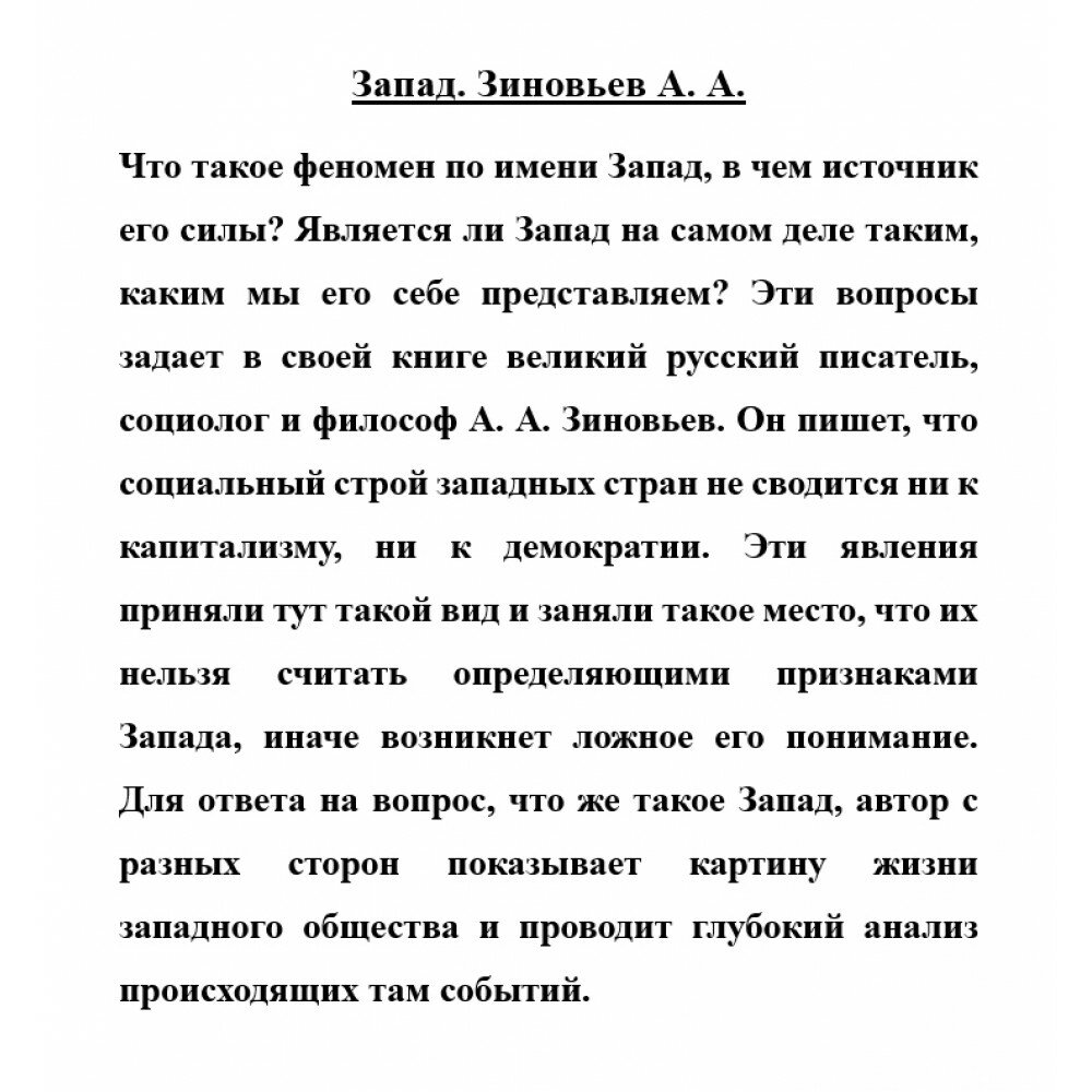 Что такое феномен по имени Запад, в чем источник его силы? Является ли Запад на самом деле таким, каким мы его себе представляем? Эти вопросы задает в своей книге великий русский писатель, социолог и философ А.А. Зиновьев.