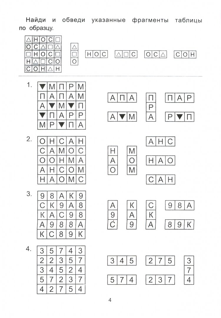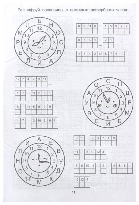 В книге множество заданий на развитие устойчивого зрительного внимания, что, в свою очередь, помогает выработке такого навыка, как усидчивость. С помощью "шифрованных" упражнений ребёнок потренирует мелкую моторику, закрепит знание счёта, букв и геометрических фигур. Большое внимание уделено развитию мышления и речи: "расшифрованные" тексты пополнят словарный запас малыша, познакомят с сокровищами русского языка - пословицами. Задания даются в виде кратких пояснений, а в некоторых случаях - с образцами выполнения в верхней части страницы.