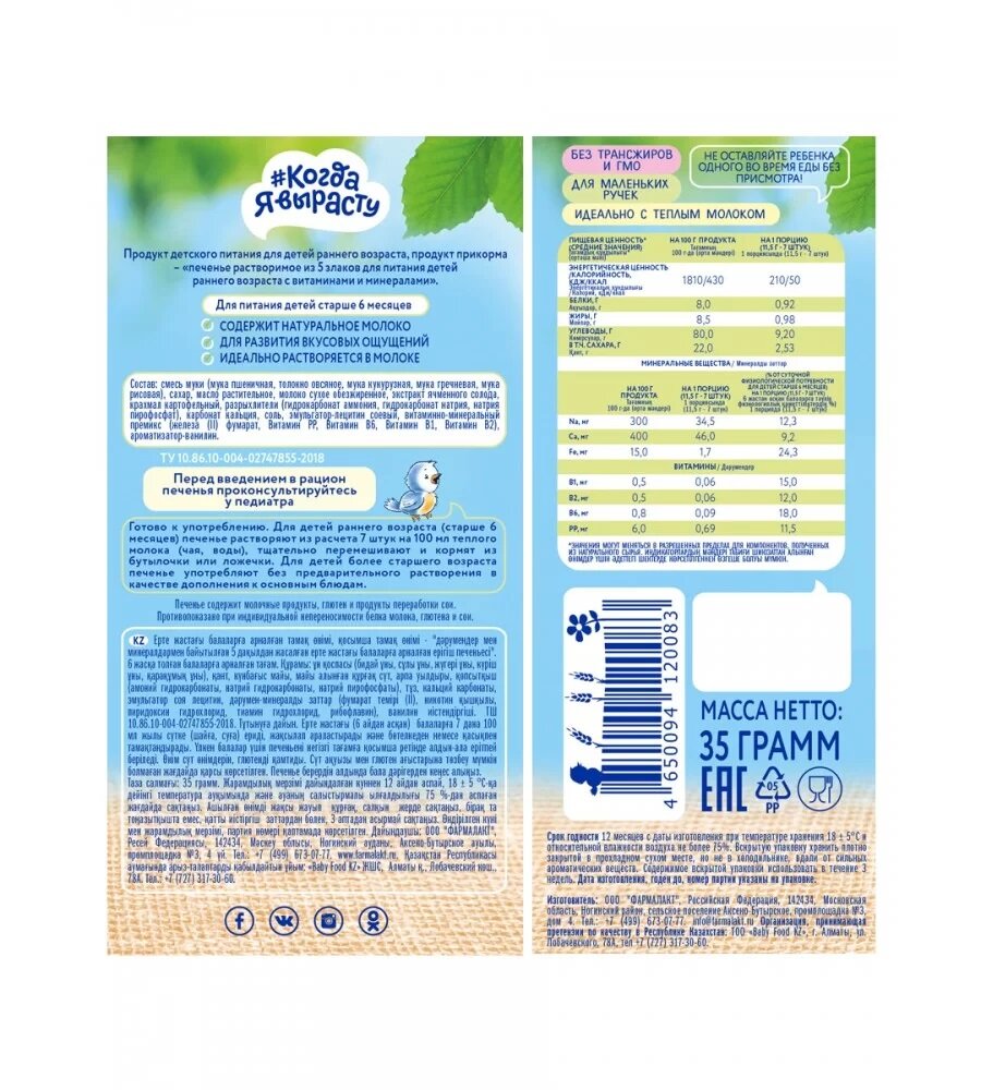 Печенье "5 злаков" - это сбалансированный и полезный детский продукт питания или дополнительного прикорма для детей старше 6 месяцев. Разнообразные форматы печенья от мини-мини, которые так удобно держать маленькими детскими ручками, до стандартных, с забавными надписями на каждом из них, превратят процесс питания в развлечение! Печенье производится на новейшем современном заводе с соблюдением высоких требований к качеству детского питания.