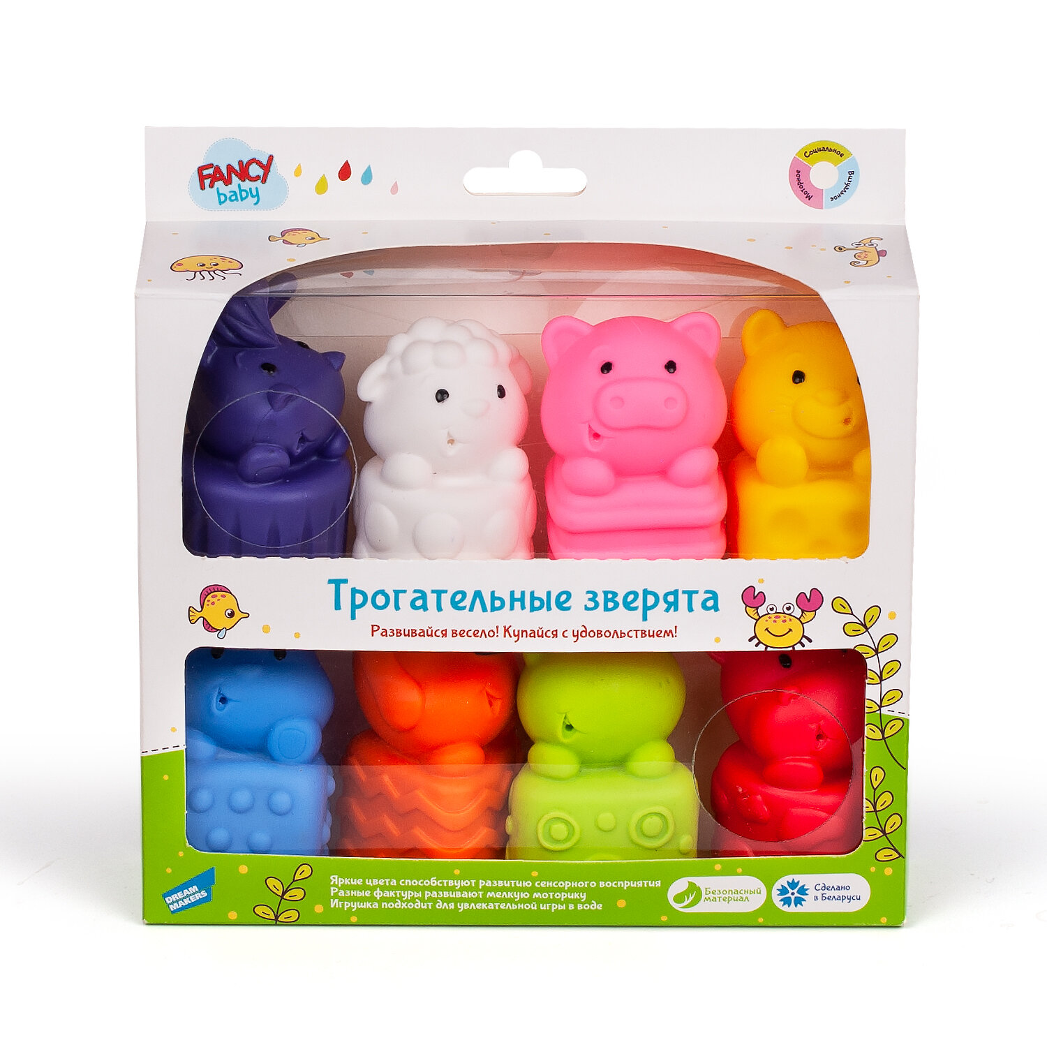 Набор развивающих игрушек "Трогательные зверята" создан специально для малышей. В набор входит 8 игрушек из мягкого ПВХ-материала в виде зверят: овечки, лошадки, поросенка, котенка, лягушки, коровки и собачки. Каждый зверек имеет свой цвет, поэтому ребенок сможет развивать не только тактильные навыки, но и изучать цвета в простой игровой форме.Игрушки приятны на ощупь и изготовлены из качественного, безвредного материала.Высота игрушки: около 6.5 см.В наборе: 8 игрушек.