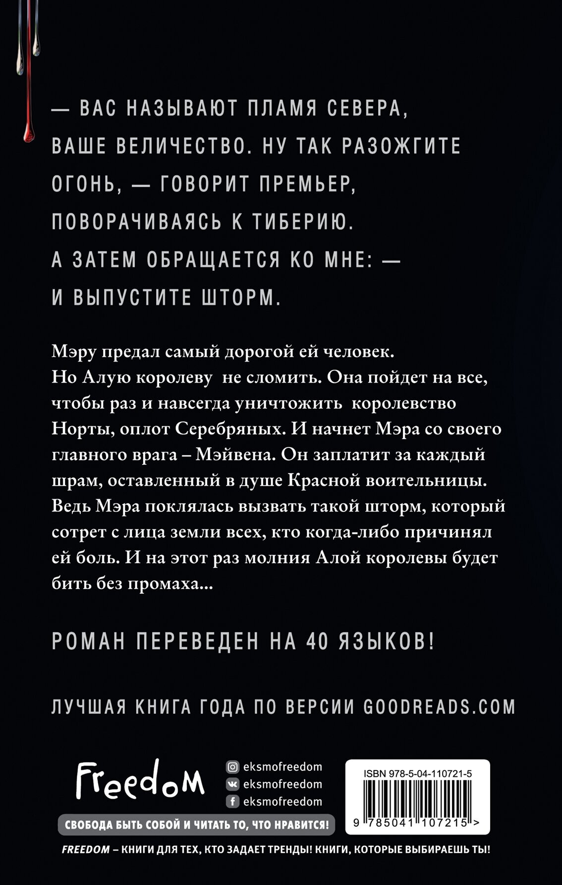 Мэру предал самый дорогой ей человек. Но Алую королеву не сломать. Она пойдет на все, чтобы раз и навсегда уничтожить королевство Норты, оплот Серебряных. И начнет Мэра со своего главного врага - Мэйвена. Он заплатит за каждый шрам, оставленный в душе Красной воительницы. Ведь Мэра поклялась вызвать такой шторм, который сотрет с лица земли всех, кто когда-либо причинял ей боль. И на этот раз молния Алой королевы будет бить без промаха...