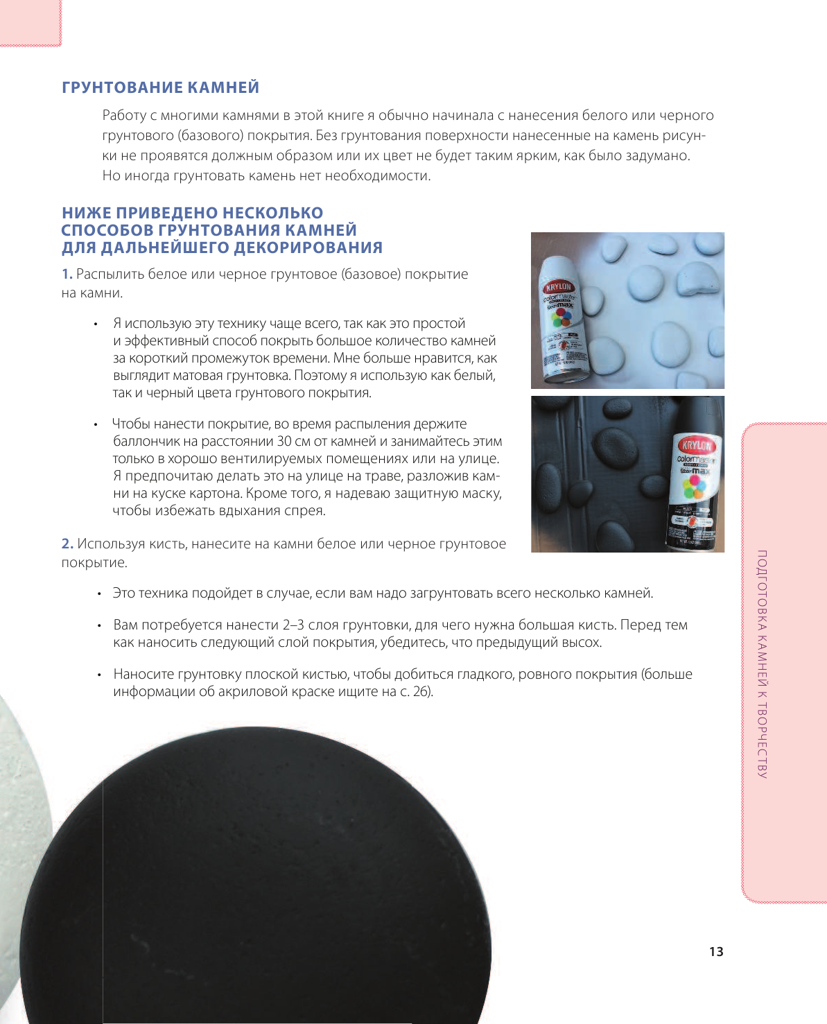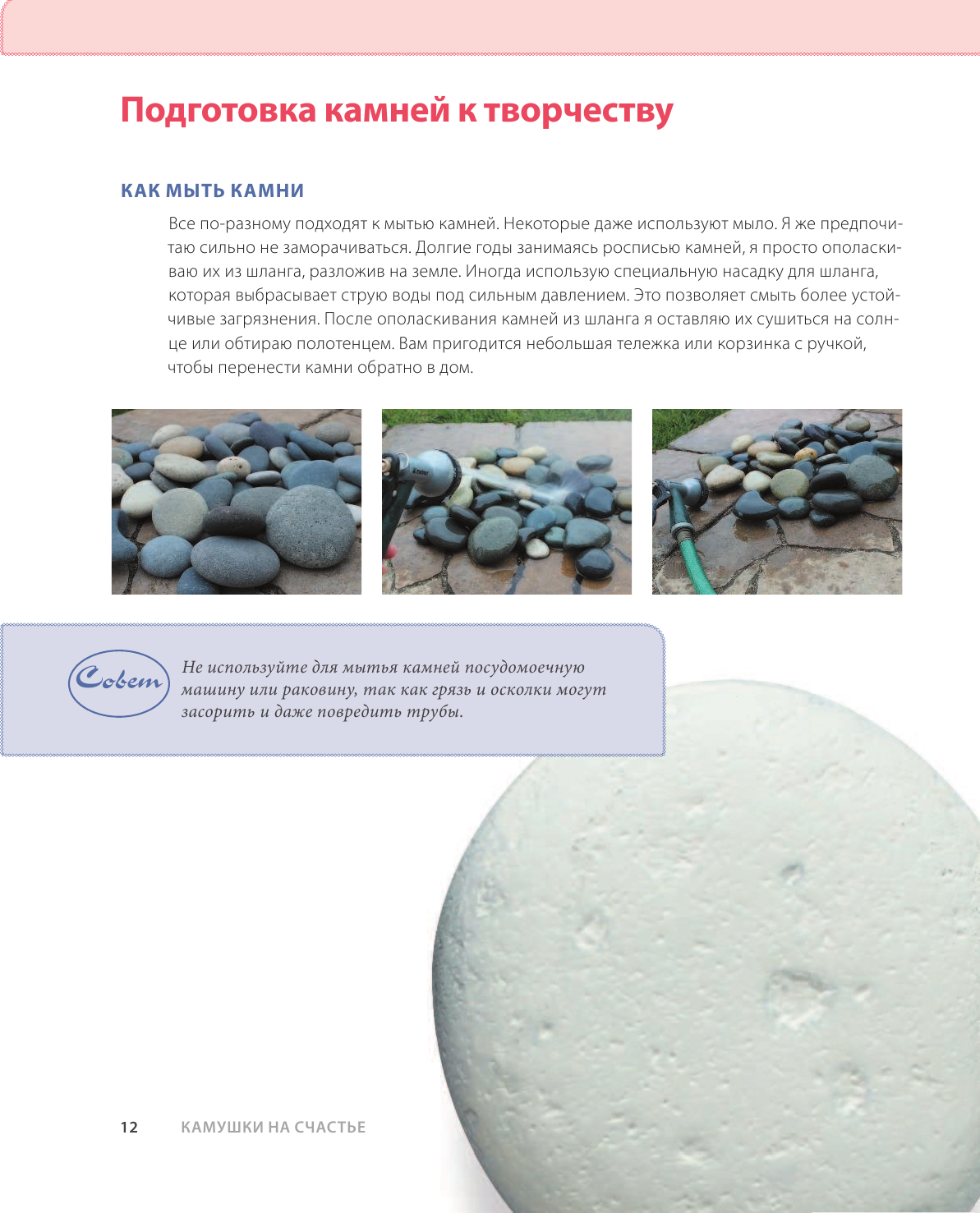 Эта красочная книга большого формата содержит множество советов и инструкций по расписыванию камешков. И не только о расписывании речь - тут и декупаж, и использование декоративного скотча, и наклеек, и бисера. А также рассказ о техниках и видах рисунков на камнях, и о использовании камней играх с детьми и их обучении. И в этом разнообразии советов книги - самое главное: можно выбрать то, что по душе, и приступить к делу. Оформление книги - и снаружи, и внутри - великолепно, "Камушки на ладони" - несомненно, активно действующий антидепрессант.
