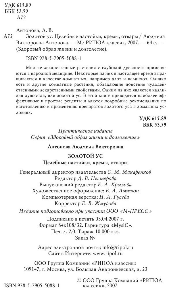 Золотой ус. Целебные настойки кремы отвары (Людмила Антонова); РИПОЛ Классик, 2007
