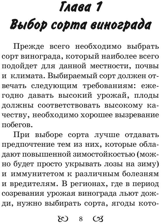 В этой книге начинающий виноградарь может найти все необходимые сведения: как правильно выбрать сорт винограда, где его сажать, как подготовить почву, как поливать и ухаживать за ягодами, как затем их собирать и хранить и какие заготовки можно сделать из спелых плодов. Благодаря рекомендациям и советам, изложенным в этой книге, даже новичок сможет избежать многих ошибок и вырастить хороший урожай винограда.