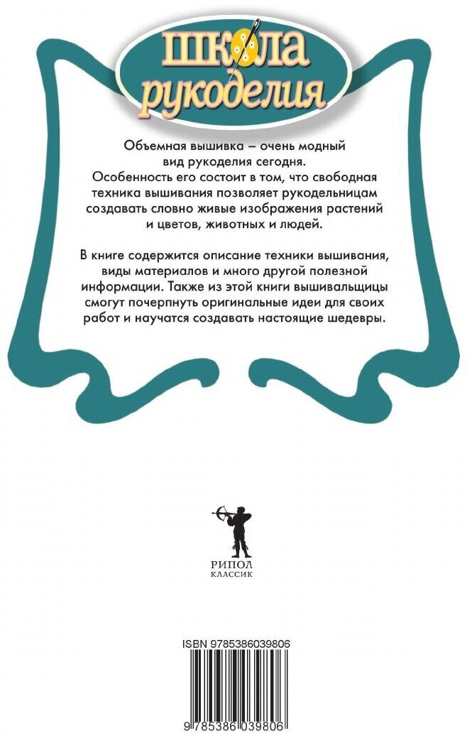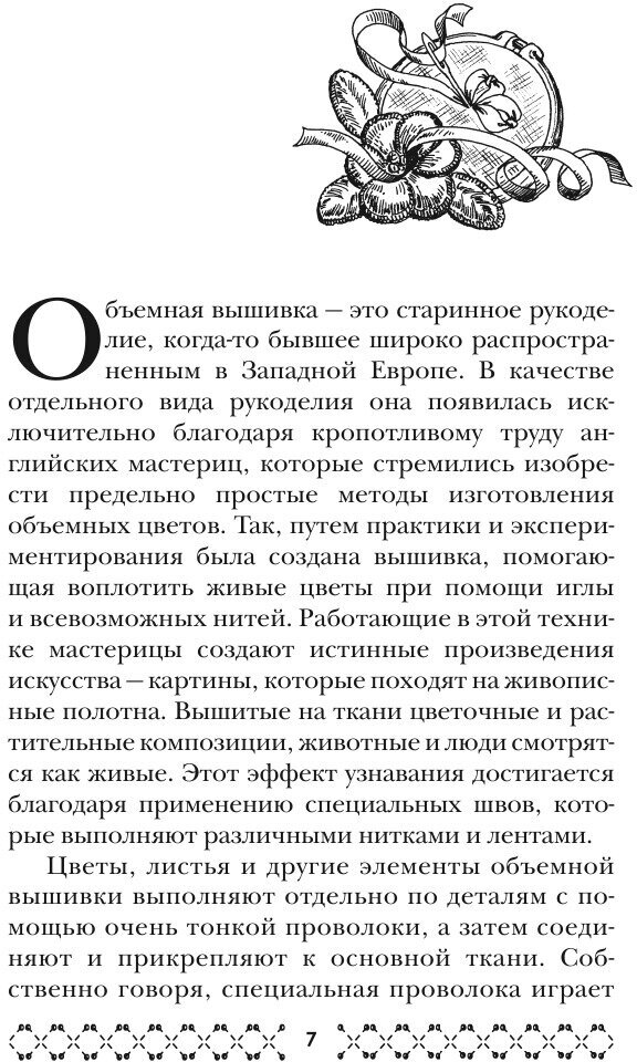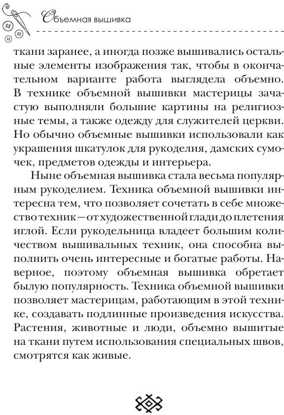 В наше время объемная вышивка – это очень модный вид рукоделия. Ее свободная техника позволяет рукодельницам создавать словно живые изображения растений и цветов, животных и людей. Техника объемной вышивки привлекательна тем, что дает быстрый результат, отнимает меньше времени и сил, чем обычное вышивание. Эта книга доставит вам удовольствие и познакомит с различными приемами работы в технике объемной вышивки.