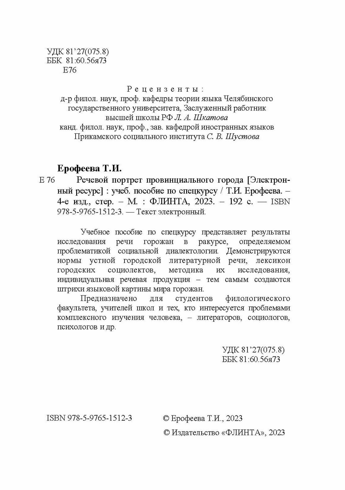 Речевой портрет провинциального города. Учебное пособие по спецкурсу (Тамара Ерофеева); Флинта, 2023