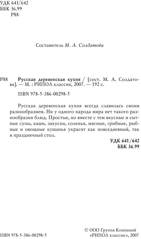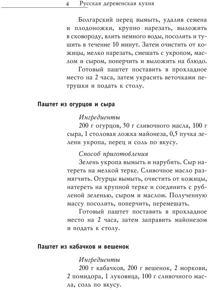 Русская деревенская кухня всегда славилась своим разнообразием. Ни у одного народа мира нет такого разнообразия блюд. Простые, но вместе с тем вкусные и сытные супы, каши, закуски, соленья, мясные, грибные, рыбные и овощные кушанья украсят как повседневный, так и праздничный стол.